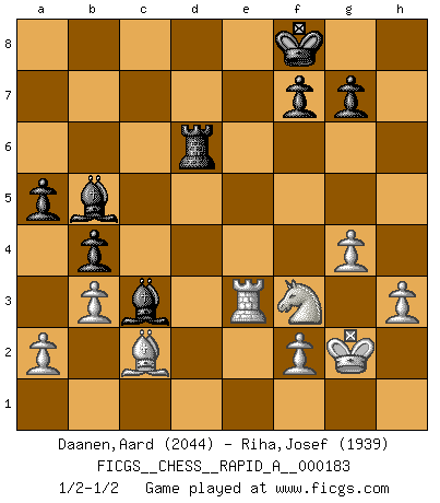 Last move : 1/2-1/2 2015 September 24 19:15:37 [Event "FICGS__CHESS__RAPID_A__000183"] [Site "FICGS"] [Date "2015.09.14"] [Round "1"] [White "Daanen,Aard"] [Black "Riha,Josef"] [Result "1/2-1/2"] [WhiteElo "2044"] [BlackElo "1939"] 1.e4 e5 2.Nf3 Nc6 3.Bb5 a6 4.Ba4 Nf6 5.O-O Be7 6.Re1 b5 7.Bb3 O-O 8.c3 d6 9.h3 Na5 10.Bc2 c5 11.d4 Qc7 12.Nbd2 cxd4 13.cxd4 Rd8 14.b3 exd4 15.Bb2 Nc6 16.Nxd4 Nxd4 17.Bxd4 Be6 18.Rc1 Qa5 19.Nf3 d5 20.exd5 Rxd5 21.Qe2 Re8 22.Rcd1 Qc7 23.Bb1 Qc8 24.Rc1 Qd7 25.Bxf6 Bxf6 26.Be4 Rd6 27.Qc2 Rc8 28.Bxh7+ Kf8 29.Qxc8+ Qxc8 30.Rxc8+ Bxc8 31.Be4 b4 32.g4 a5 33.Re2 Bc3 34.Kg2 Ba6 35.Re3 Bb5 36.Bc2 1/2-1/2 Ruy Lopez : Closed, 7...O-O Kingside Castling by player White (move 5) Kingside Castling by player Black (move 7) This chess game ended in a draw. Follow this game move after move (download)Morphy was probably the greatest genius of them all. (Bobby Fischer) Wenn ich gewinne bin ich ein Genie. Wenn nicht, dann bin ich keines. (Robert James Fischer) Por tratar de evitar la pérdida de una pieza, muchas personas han perdido una partida de Ajedrez. (Savielly Tartakover) On croit qu'il y a plus de mauvais joueurs que de bons joueurs, c'est faux : Il y a autant de joueurs qui gagnent que de joueurs qui perdent. (Philippe Geluck) Nothing is more important for teaching us to understand the concepts we have than constructing fictitious ones. (Ludwig Wittgenstein)