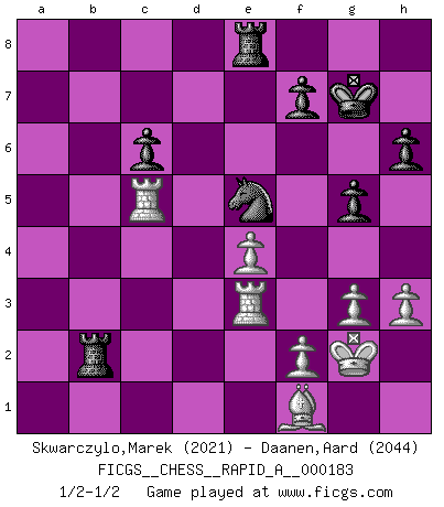 Last move : 1/2-1/2 2015 November 24 8:4:45 [Event "FICGS__CHESS__RAPID_A__000183"] [Site "FICGS"] [Date "2015.09.14"] [Round "1"] [White "Skwarczylo,Marek"] [Black "Daanen,Aard"] [Result "1/2-1/2"] [WhiteElo "2021"] [BlackElo "2044"] 1.d4 Nf6 2.Nf3 d5 3.c4 c6 4.Nc3 e6 5.e3 Nbd7 6.Bd3 dxc4 7.Bxc4 b5 8.Bd3 Bd6 9.O-O O-O 10.Bd2 Bb7 11.Rc1 Rc8 12.a3 a5 13.Bb1 b4 14.axb4 axb4 15.Na4 Qa5 16.e4 e5 17.Re1 Rfe8 18.dxe5 Nxe5 19.Nxe5 Bxe5 20.Nc5 Ba6 21.Nxa6 Qxa6 22.Bxb4 Bxb2 23.Bd3 Qb7 24.Rc4 Nd7 25.Bc3 Bxc3 26.Rxc3 Ne5 27.Bf1 Rcd8 28.Qc1 Qb4 29.Qe3 h6 30.h3 g5 31.Rec1 Qd4 32.g3 Qxe3 33.Rxe3 Kg7 34.Rc5 Rd2 35.Kg2 Rb2 1/2-1/2 Queen's pawn game Kingside Castling by player White (move 9) Kingside Castling by player Black (move 9) This chess game ended in a draw. Follow this game move after move (download)All I want to do, ever, is just play Chess. (Bobby Fischer) Ich trinke, ich rauche, ich spiele, ich liebe Frauen aber Fernschach ist ein Laster, das ich nicht habe. (Mikhail Nekhemyevich Tal) Coloca el contenido del tablero de Ajedrez en un sombrero, agita las piezas vigorosamente, derrámalas en el tablero desde una altura de medio metro y así obtienes el estilo de Wilhelm Steinitz. (H. E. Bird) Il vaut mieux sacrifier les pièces de l'adversaire. (Xavier Tartacover) Always remember that you are unique; just like everyone else. (Unknown)
