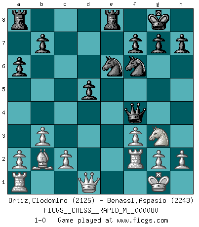 Last move : 1-0 2015 October 14 20:6:9 [Event "FICGS__CHESS__RAPID_M__000080"] [Site "FICGS"] [Date "2015.09.14"] [Round "1"] [White "Ortiz,Clodomiro"] [Black "Benassi,Aspasio"] [Result "1-0"] [WhiteElo "2125"] [BlackElo "2243"] 1.d4 e6 2.e4 d5 3.Nd2 c5 4.Ngf3 Nf6 5.exd5 exd5 6.Bb5+ Bd7 7.Bxd7+ Nbxd7 8.O-O Be7 9.dxc5 Nxc5 10.Nb3 Nce4 11.Nfd4 O-O 12.Nf5 Re8 13.Nxe7+ Rxe7 14.Nd4 Re8 15.f3 Nc5 16.b3 Ne6 17.Bb2 Qc7 18.Rf2 a6 19.Nf5 Qf4 20.Ng3 1-0 Queen's pawn Kingside Castling by player White (move 8) Kingside Castling by player Black (move 11) Player White won this chess game. Follow this game move after move (download)He who fears an isolated Queen's Pawn should give up Chess. (Siegbert Tarrasch) Ich habe die Schachforschung dermaßen betrieben, dass sie auf eine wissenschaftliche Basis gestellt wurde. (Mikhail Moiseyevich Botvinik) El Ajedrez es un cuento de Hadas de las 1001 metidas de pata. (Savielly Tartakower) La solitude du joueur d'Echecs à l'approche du mat est semblable à celle du condamné. (Francis Szpiner) Whatever you do, don't be bored. This is absolutely the most exciting time we could have possibly hoped to be alive. And things are just starting. (From movie Waking life)