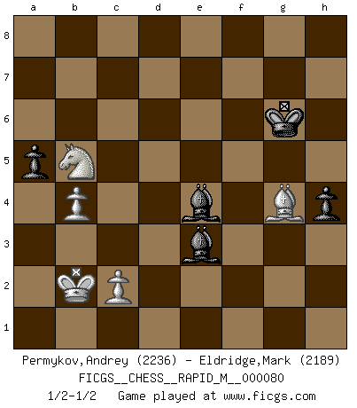 Last move : 1/2-1/2 2015 November 20 11:49:52 [Event "FICGS__CHESS__RAPID_M__000080"] [Site "FICGS"] [Date "2015.09.14"] [Round "1"] [White "Permykov,Andrey"] [Black "Eldridge,Mark"] [Result "1/2-1/2"] [WhiteElo "2236"] [BlackElo "2189"] 1.e4 c5 2.Nf3 d6 3.d4 cxd4 4.Nxd4 Nf6 5.Nc3 g6 6.Be3 Bg7 7.h3 O-O 8.Qd2 d5 9.exd5 Nxd5 10.O-O-O Nxe3 11.Qxe3 Qa5 12.Qxe7 Nc6 13.Nb3 Nxe7 14.Nxa5 Be6 15.Ne4 b6 16.Nb3 Bd5 17.Nc3 Bc6 18.Rg1 Rfd8 19.Rxd8+ Rxd8 20.Ba6 Nf5 21.g3 Bf3 22.Kb1 Nd4 23.Nd2 Bc6 24.Rd1 Kf8 25.Nb3 Ke7 26.Nc1 Nf3 27.Rxd8 Kxd8 28.N1e2 Bh6 29.Nb5 Bd7 30.Nxa7 Bxh3 31.Nc6+ Kc7 32.Nb4 Nd2+ 33.Ka1 Kd6 34.Bd3 f5 35.Nc3 Bg2 36.Nb5+ Ke5 37.Be2 f4 38.Nd3+ Kf5 39.a4 fxg3 40.fxg3 Be3 41.b4 Bc6 42.g4+ Kg5 43.Kb2 h5 44.gxh5 gxh5 45.Ne5 Bg2 46.Nf7+ Kg6 47.Nfd6 h4 48.Bg4 Ne4 49.Nxe4 Bxe4 50.a5 bxa5 1/2-1/2 Sicilian : Dragon, 6.Be3 Kingside Castling by player Black (move 7) Queenside Castling by player White (move 10) 10 pieces endgame at move 50 : White KBNPP , Black KBBPP WHITE : King + 1 Bishop 1 Knight 2 Pawns BLACK : King + 2 Bishops 2 Pawns This chess game ended in a draw. Follow this game move after move (download)No other master has such a terrific will to win. At the board he radiates danger, and even the strongest opponents tend to freeze, like rabbits when they smell a panther. Even his weaknesses are dangerous. As white, his opening game is predictable - you can make plans against it - but so strong that your plans almost never work. In the middle game his precision and invention are fabulous, and in the end game you simply cannot beat him. (Anonymous German Expert) Kein Schachspieler kann gut schlafen. (H. G. Wells) En la vida, como en el Ajedrez, los Peones propios obstruyen nuestro camino. La gran fortuna de un hombre, su comodidad, placer, hijos, libros, que deberían ayudarle a ganar, con mucha frecuencia lo ponen en Jaque Mate. (Charles Buxton) Aux échecs, l'amour-propre est satisfait quand on remporte la victoire, mais il n'y a pas de honte à être battu. (Benjamin Franklin) All the troubles of the world come from being unable to sit alone in a quiet room. (Blaise Pascal)