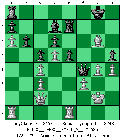 Last move : 1/2-1/2 2015 November 14 12:0:33 [Event "FICGS__CHESS__RAPID_M__000080"] [Site "FICGS"] [Date "2015.09.14"] [Round "1"] [White "Cade,Stephen"] [Black "Benassi,Aspasio"] [Result "1/2-1/2"] [WhiteElo "2193"] [BlackElo "2243"] 1.d4 e6 2.c4 Nf6 3.Nc3 Bb4 4.e3 O-O 5.Bd3 c5 6.Nf3 b6 7.O-O Bxc3 8.bxc3 Bb7 9.Nd2 d6 10.e4 Nc6 11.Bb2 e5 12.d5 Ne7 13.Re1 Ng6 14.g3 Bc8 15.Nf1 Bg4 16.f3 Bd7 17.Ne3 h6 18.a4 Nh7 19.Nf5 Qf6 20.Qc2 Ne7 21.Bc1 h5 22.a5 Nxf5 23.exf5 Rfb8 24.Be3 Qd8 25.a6 Qf6 26.Kg2 Re8 27.h3 Re7 28.g4 g6 29.fxg6 fxg6 30.Bxg6 Ng5 31.Bxg5 Qxg5 32.h4 Qf4 1/2-1/2 Queen's pawn Kingside Castling by player Black (move 4) Kingside Castling by player White (move 7) This chess game ended in a draw. Follow this game move after move (download)Help your pieces so they can help you. (Paul Morphy) Im Blitz ist es einfacher mit einer Figur weniger anzugreifen, als sich mit einer Mehrfigur zu verteidigen. (Mikhail Nekhemyevich Tal) El Ajedrez, como cualquier otra actividad creativa, puede existir solo a través de méritos combinados de aquellos que tienen talento creativo y de aquellos que tienen la habilidad de organizar un trabajo creativo. (Mikhail Botvinnik) Il n'y a pas eu de défaite parce que je ne crois pas que cet ordinateur ait jamais existé. IBM a triché en refusant d'imprimer les modes de recherche de la machine. C'est évident, pendant le match, des coups décisifs ont été joués par des êtres humains. Aujourd'hui, les meilleurs spécialistes en informatique ne peuvent toujours pas expliquer comment Deep-Blue a pu jouer contre la logique des ordinateurs. IBM a gagné une guerre de communication, mais ils sont incapables de prouver que l'ordinateur a gagné tout seul. (Garry Kasparov) Bobby never cared about money, though. His only desire was to prove that his choices were correct: He wanted chess to be important because he was a chess player, and he wanted to be important. Bobby knew money was important, but he didn't have a clue why, outside of clothes and status. The only way he could accomplish what he wanted was to fight for a lot of money. Once he got it, he gave it away. He did not know how to spend it. And once he'd become champion, after, essentially, sacrificing his life for it, he didn't know how to spend his time. (Bob Wade)