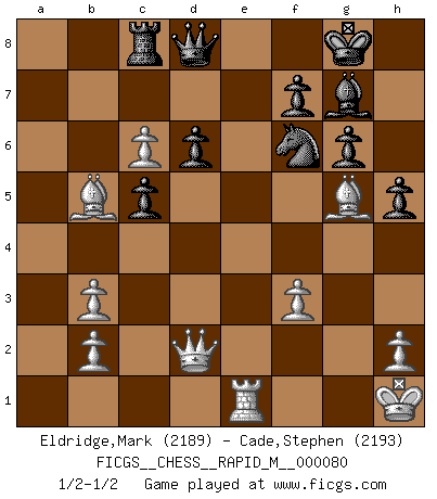 Last move : 1/2-1/2 2015 October 17 12:5:33 [Event "FICGS__CHESS__RAPID_M__000080"] [Site "FICGS"] [Date "2015.09.14"] [Round "1"] [White "Eldridge,Mark"] [Black "Cade,Stephen"] [Result "1/2-1/2"] [WhiteElo "2189"] [BlackElo "2193"] 1.e4 c5 2.Nf3 d6 3.d4 cxd4 4.Nxd4 Nf6 5.Nc3 a6 6.Be3 e5 7.Nb3 Be6 8.f3 h5 9.Nd5 Bxd5 10.exd5 Nbd7 11.Qd2 g6 12.Be2 Bg7 13.O-O b6 14.c4 O-O 15.Kh1 Re8 16.Bg5 Qc7 17.Rae1 Rac8 18.Be3 a5 19.Na1 e4 20.Nb3 Ne5 21.Rc1 Qe7 22.Bg5 exf3 23.gxf3 Nc6 24.Rce1 a4 25.c5 axb3 26.dxc6 bxc5 27.Bb5 Qd8 28.Rxe8+ Qxe8 29.Re1 Qd8 30.axb3 1/2-1/2 Sicilian : Najdorf, Byrne (English) attack Kingside Castling by player White (move 13) Kingside Castling by player Black (move 14) This chess game ended in a draw. Follow this game move after move (download)Play the opening like a book, the middle game like a magician, and the endgame like a machine. (Spielmann) Die Partien sind immer verschieden, die Interviews immer die gleichen. (Garry Kasparov) El hombre es un frívolo, una creatura engañosa y como un jugador de Ajedrez, se preocupa mas por el proceso de obtener su meta que de la meta por sí misma. (Dostoyevsky) Mon pion favori sur ma case favorite ! Bronstein en parlant d'un coup de pion en h5 quand il avait les Noirs. Creativity is allowing yourself to make mistakes. Art is knowing which ones to keep. (Scott Adams)