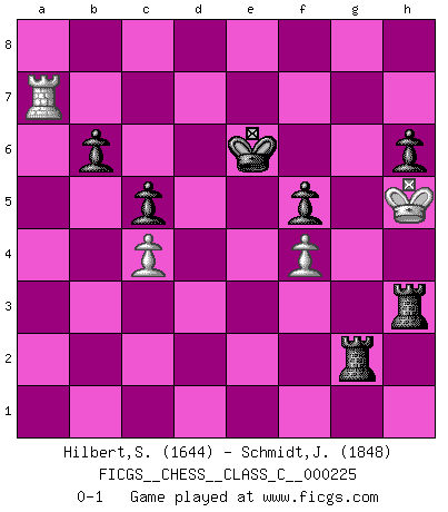 Last move : 0-1 2016 February 6 20:7:29 [Event "FICGS__CHESS__CLASS_C__000225"] [Site "FICGS"] [Date "2015.09.14"] [Round "1"] [White "Hilbert,Stephan J."] [Black "Schmidt,Jonny"] [Result "0-1"] [WhiteElo "1644"] [BlackElo "1848"] 1.a3 Nf6 2.Nf3 d5 3.d4 e6 4.e3 Nbd7 5.Bd3 b6 6.O-O c5 7.c3 Bd6 8.b3 O-O 9.Bb2 e5 10.dxe5 Nxe5 11.Be2 Nxf3+ 12.Bxf3 Qc7 13.g3 Bh3 14.Bg2 Bxg2 15.Kxg2 Rfe8 16.Nd2 Rad8 17.Qc2 Ng4 18.Qf5 Ne5 19.c4 dxc4 20.bxc4 Qc6+ 21.Kg1 Bc7 22.Bxe5 Bxe5 23.Nf3 Bxa1 24.Rxa1 Qe4 25.Qxe4 Rxe4 26.Rc1 Rd3 27.a4 Ra3 28.Nd2 Re8 29.Kg2 Rxa4 30.Rc3 Rd8 31.Ne4 f5 32.Ng5 Ra2 33.Ne6 R8d2 34.Kh3 Rxf2 35.Kh4 h6 36.h3 Rf3 37.Rd3 Rg2 38.Rd8+ Kf7 39.Nf4 g5+ 40.Kh5 gxf4 41.exf4 Rfxg3 42.Rd7+ Ke6 43.Rxa7 Rxh3+ 0-1 Anderssen's Opening Kingside Castling by player White (move 6) Kingside Castling by player Black (move 8) Player Black won this chess game. Follow this game move after move (download)A sacrifice is best refuted by accepting it. (Wilhelm Steinitz) Sehr viele beherrschen heutzutage das große Einmalseins des Schachspiels und kennen sogar dessen Logarithmentafeln auswendig - deshalb sollte man hin und wieder zu beweisen trachten, dass zwei mal zwei auch fünf sein kann. (Mikhail Nekhemyevich Tal) El Ajedrez es tan inspirador que yo no creo que un buen jugador sea capaz de tener un pensamiento malo durante una partida. (Wilhelm Steinitz) Le temps de noter son nom sur la feuille de partie, j'étais déjà en zeitnot ! D'un modeste amateur apparié lors de la première ronde d'un open contre le grand-maître Azmaïparashvili. I know the human being and fish can coexist peacefully. (George W. Bush, Saginaw sept. 29, 2000)