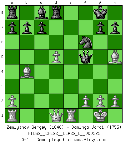 Last move : 0-1 2016 March 20 18:50:41 [Event "FICGS__CHESS__CLASS_C__000225"] [Site "FICGS"] [Date "2015.09.14"] [Round "1"] [White "Zemlyanov,Sergey"] [Black "Domingo,Jordi"] [Result "0-1"] [WhiteElo "1646"] [BlackElo "1755"] 1.e4 e5 2.Nf3 f5 3.exf5 e4 4.Nd4 Qf6 5.c3 Nc6 6.d3 Nxd4 7.cxd4 Bb4+ 8.Nc3 Qxd4 9.Be2 Bxc3+ 10.bxc3 Qxc3+ 11.Bd2 Qe5 12.O-O Nf6 13.dxe4 O-O 14.Bb4 Re8 15.Re1 d5 16.Bh5 Rd8 17.exd5 Qxf5 0-1 This chess game has been lost on time (started : 2015.09.14 23:48:32) Latvian counter-gambit Kingside Castling by player White (move 12) Kingside Castling by player Black (move 13) Player Black won this chess game. Follow this game move after move (download)Chess is thirty to forty percent psychology. You don't have this when you play a computer. I can't confuse it. (Judith Polgar) Ich verstehe Aljechins Kombinationen ganz gut; aber woher er diese Angriffschancen bekommt und wie er die Eröffnung behandelt das ist für mich ein Buch mit sieben Siegeln. (Rudolf Spielmann) No hay otro maestro que tenga una voluntad terrífica de ganar. Al tablero, el irradía peligro y aún los oponentes mas fuertes tienden a congelarse como liebres cuando olfatean a una pantera. Aún sus debilidades son peligrosas. Con las blancas, su juego de apertura es predecible - te es posible hacer planes en su contra - pero es tan fuerte que tus planes casi nunca funcionan. En el juego medio, su precisión e invención son fabulosas y en finales, tú simplemente no le puedes vencer. (Experto Alemán anónimo) Pour moi, les échecs ne sont pas un jeu mais un art. (Alexandre Alekhine) Wisdom is the reward you get for a lifetime of listening when you'd have preferred to talk. (Doug Larson)