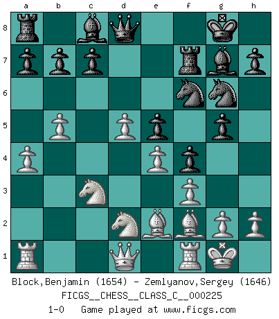 Last move : 1-0 2016 February 29 17:17:8 [Event "FICGS__CHESS__CLASS_C__000225"] [Site "FICGS"] [Date "2015.09.14"] [Round "1"] [White "Block,Benjamin"] [Black "Zemlyanov,Sergey"] [Result "1-0"] [WhiteElo "1654"] [BlackElo "1646"] 1.d4 Nf6 2.c4 g6 3.Nc3 Bg7 4.e4 d6 5.Nf3 O-O 6.Be2 e5 7.O-O Nc6 8.d5 Ne7 9.b4 Ne8 10.c5 f5 11.Nd2 Nf6 12.f3 f4 13.a4 g5 14.Ba3 Ng6 15.b5 dxc5 16.Bxc5 Rf7 17.Bf2 1-0 This chess game has been lost on time (started : 2015.09.14 23:48:32) King's Indian : Orthodox, Aronin-Taimanov variation (Yugoslav attack / Mar del Plata variation) Kingside Castling by player Black (move 5) Kingside Castling by player White (move 7) Player White won this chess game. Follow this game move after move (download)Later, I began to succeed in decisive games. Perhaps because I realized a very simple truth: not only was I worried, but also my opponent. (Mikhail Tal) Stil? Ich habe keinen Stil! (Anatoly Karpov) El Ajedrez es parte de una cultura y si una cultura esta en decadencia, entonces también el Ajedrez declinará. (Mikhail Botvinnik) La victoire dans une partie d'Echecs appartient la plupart du temps à celui qui voit un peu plus loin que l'adversaire. (Lasker) Convictions are more dangerous enemies of truth than lies. (Friedrich Nietzsche)