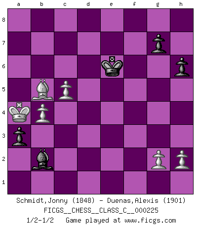 Last move : 1/2-1/2 2016 January 23 19:11:29 [Event "FICGS__CHESS__CLASS_C__000225"] [Site "FICGS"] [Date "2015.09.14"] [Round "1"] [White "Schmidt,Jonny"] [Black "Duenas,Alexis"] [Result "1/2-1/2"] [WhiteElo "1848"] [BlackElo "1901"] 1.e4 c5 2.Nf3 d6 3.d4 cxd4 4.Nxd4 Nf6 5.Nc3 a6 6.Bg5 e6 7.f4 Be7 8.Qf3 h6 9.Bh4 Qc7 10.O-O-O Nbd7 11.Be2 b5 12.Bxf6 Nxf6 13.e5 Bb7 14.Qg3 dxe5 15.fxe5 Nd5 16.Nxe6 fxe6 17.Qg6+ Kd7 18.Bg4 Qxe5 19.Nxd5 Qg5+ 20.Qxg5 Bxg5+ 21.Kb1 Bxd5 22.Rxd5+ Kc7 23.Rc5+ Kb6 24.Re5 Rhe8 25.Rhe1 Rac8 26.Bf3 Rc7 27.Rxe6+ Rxe6 28.Rxe6+ Ka7 29.c3 Rd7 30.a4 bxa4 31.Be2 Kb8 32.Rxa6 Ra7 33.Ka2 Rxa6 34.Bxa6 Be7 35.Bb5 a3 36.b4 Bf6 37.c4 Bb2 38.Bc6 Kc7 39.Bd5 Kb6 40.c5+ Kb5 41.Kb3 Bc1 42.Be4 Bb2 43.Bg6 Kc6 44.Be8+ Kd5 45.Ka4 Ke6 46.Bb5 1/2-1/2 Sicilian : Najdorf, 7...Be7 Queenside Castling by player White (move 10) This chess game ended in a draw. Follow this game move after move (download)When you see a good move, look for a better one. (Emanuel Lasker) Du musst Deinen Gegner in einen tiefen dunklen Wald führen wo 2+2=5 ist und wo der Weg, der wieder hinausführt, nur breit genug für einen ist. (Mikhail Nekhemyevich Tal) Los Peones son el alma de una partida de Ajedrez. (Francois Andre Danican Philidor) Les réformistes prétendent que les progrès de la théorie conduiront à la disparition des échecs, et qu'il faut, pour leur rendre vie, en remanier les règles. En réalité, qu'exprime cette affirmation? Le mépris de l'intuition, de l'imagination et de tous les autres éléments qui font des échecs un art. (Alexander Alekhine) A good book on your shelf is a friend that turns its back on you and remains a friend. (Author unknown)