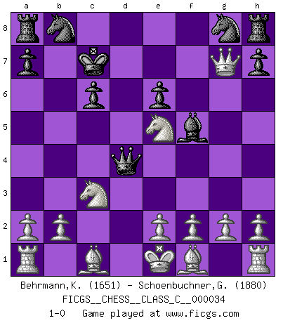 Last move : 1-0 2007 March 24 13:6:3 [Event "FICGS__CHESS__CLASS_C__000034"] [Site "FICGS"] [Date "2007.03.11"] [Round "1"] [White "Behrmann,Klaus"] [Black "Schoenbuchner,Gert"] [Result "1-0"] [WhiteElo "1651"] [BlackElo "1880"] 1.d4 d5 2.c4 c6 3.Nf3 Bg4 4.Ne5 Bf5 5.cxd5 Qxd5 6.Nc3 Qd6 7.Qb3 e6 8.Qxb7 Qxd4 9.Qxf7+ Kd8 10.Qxf8+ Kc7 11.Qxg7+ 1-0 QGD Slav : 3.Nf3 Player White won this chess game. Follow this game move after move (download)I play correspondence chess because it is both art and science while chess is art only. (A player at FICGS) Um dein Spiel zu verbessern musst du zuallererst das Endspiel studieren, denn diese kann unabhängig studiert werden. Die Eröffnung und das Mittelspiel müssen immer in Bezug gesetzt werden zum Endspiel. (José Raúl Capablanca) Ciertamente el estado mental actual de Bobby Fischer es una tragedia. Uno de los mas grandes jugadores de Ajedrez del mundo -el orgullo y pena del Ajedrez Americano. (Frank Brady) Un millionnaire : 'Monsieur Steinitz ! Vous ne participez aux tournois que pour l'argent, alors que moi je n'y viens que pour l'honneur.' Steinitz : 'Chacun joue pour ce qu'il n'a pas'... Perfection is achieved, not when there is nothing more to add, but when there is nothing left to take away. (Antoine de Saint-Exupéry)