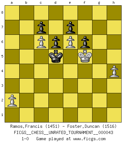 Last move : 1-0 2015 October 19 16:51:7 [Event "FICGS__CHESS__UNRATED_TOURNAMENT__000043"] [Site "FICGS"] [Date "2015.09.17"] [Round "1"] [White "Ramos,Francis"] [Black "Foster,Duncan"] [Result "1-0"] [WhiteElo "1451"] [BlackElo "1516"] 1.e4 b6 2.d4 Bb7 3.d5 d6 4.c4 Nd7 5.f4 g6 6.Qd4 f6 7.Nf3 Bg7 8.Ng5 Bh6 9.Ne6 Qc8 10.Nc3 Nc5 11.f5 Bxc1 12.Rxc1 g5 13.Be2 h5 14.Bxh5+ Kd7 15.Bf3 Qe8 16.b4 Nxe6 17.dxe6+ Kc8 18.Nd5 Rh6 19.c5 Qa4 20.Qb2 Bxd5 21.exd5 bxc5 22.bxc5 Rb8 23.Qd2 Qb4 24.Qxb4 Rxb4 25.c6 R6h4 26.O-O Nh6 27.Rb1 Rxb1 28.Rxb1 Nxf5 29.Rb7 a5 30.Be2 Rb4 31.Ra7 Kb8 32.Rxa5 Rb1+ 33.Kf2 Rb2 34.Rb5+ Rxb5 35.Bxb5 Nd4 36.Bd3 Ka7 37.Kg3 Kb6 38.Kg4 Kc5 39.Be4 Nb5 40.Kf5 Nc3 41.g3 Nxd5 42.Bxd5 Kxd5 43.h4 gxh4 44.gxh4 1-0 Owen defense Kingside Castling by player White (move 26) 10 pieces endgame at move 44 : White KPPPP , Black KPPPP WHITE : King + 4 Pawns BLACK : King + 4 Pawns Player White won this chess game. Follow this game move after move (download)Chess problems demand from the composer the same virtues that characterize all worthwhile art: originality, invention, conciseness, harmony, complexity, and splendid insincerity. (Vladimir Nabokov) Der Partner hat auch seine Existenzberechtigung. (Savielly Grigorievitsch Tartakower) El Ajedrez es un mar en el cual un mosquito puede beber y un elefante puede bañarse. (Refrán Hindú) Ne tendez aucun piège pour le plaisir ! Ne jouez rien dans l'espoir que l'adversaire réagisse de façon stupide ! Prenez toujours pour acquis que l'adversaire va trouver le meilleur coup ! Ne jouez jamais de coup dans l'espoir que l'adversaire ne voie pas la menace ! Chacun de vos coups doit améliorer la position d'une façon ou d'une autre. Even the best needles are not sharp at both ends. (Chinese proverb)