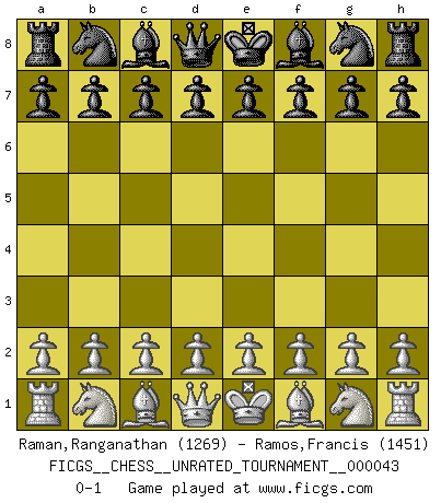 Last move : 0-1 2015 October 27 15:14:15 [Event "FICGS__CHESS__UNRATED_TOURNAMENT__000043"] [Site "FICGS"] [Date "2015.09.17"] [Round "1"] [White "Raman,Ranganathan"] [Black "Ramos,Francis"] [Result "0-1"] [WhiteElo "1269"] [BlackElo "1451"] 0-1 This chess game has been lost on time (started : 2015.09.17 11:57:42) Player Black won this chess game. Follow this game move after move (download)An attack on the wing should be met by play in the center. (Nimzovitch) Frage: Was machen Sie mit den Preisen? Anwort: Ich habe Angst, dass meine Freundin davon neue Kleider kauft. (Loek van Wely) Bobby es el jugador de Ajedrez mas fino que este país jamás haya producido. Su memoria para las movidas, su brillantez en soñar combinaciones y su feróz determinación por la victoria son algo extraño. (John Collins) 'L'échange des dames est un coup dur pour les deux adversaires...' Un journaliste lors d'une partie du match Spassky-Fischer May I never be complete. May I never be content. May I never be perfect. Deliver me, Tyler, from being perfect and complete. (Chuck Palahniuk, Fight Club)