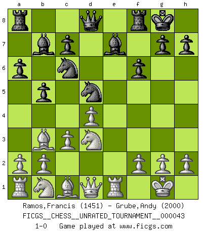 Last move : 1-0 2015 December 1 7:54:48 [Event "FICGS__CHESS__UNRATED_TOURNAMENT__000043"] [Site "FICGS"] [Date "2015.09.17"] [Round "1"] [White "Ramos,Francis"] [Black "Grube,Andy"] [Result "1-0"] [WhiteElo "1451"] [BlackElo "2000"] 1.e4 e5 2.Nf3 Nc6 3.Bb5 a6 4.Ba4 Nf6 5.O-O Be7 6.Re1 b5 7.Bb3 O-O 8.c3 d5 9.exd5 Nxd5 10.Nxe5 Bb7 11.d4 f6 12.Nd3 1-0 Ruy Lopez : Closed, 7...O-O Kingside Castling by player White (move 5) Kingside Castling by player Black (move 7) Player White won this chess game. Follow this game move after move (download)Fischer is completely natural. He plays no roles. He's like a child. Very, very simple. (Zita Rajcsanyi) Computer sind die einzigen Gegner, die nicht immer eine Ausrede auf Lager haben, wenn sie gegen mich verlieren. (Robert James Fischer) Yo no le temo a Spassky. Todos saben que yo soy el mejor. Uno no necesita un torneo para probarlo. (Bobby Fischer) Les échecs, c'est l'art d'analyser. (Mikhail Botvinnik) The difference between stupidity and genius is that genius has its limits. (Murphy)