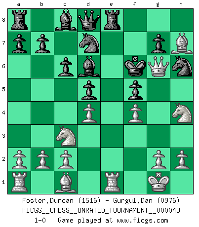 Last move : 1-0 2015 October 24 13:29:29 [Event "FICGS__CHESS__UNRATED_TOURNAMENT__000043"] [Site "FICGS"] [Date "2015.09.17"] [Round "1"] [White "Foster,Duncan"] [Black "Gurgui,Dan"] [Result "1-0"] [WhiteElo "1516"] [BlackElo "0976"] 1.e4 d6 2.d4 c6 3.Nc3 e6 4.f4 Nd7 5.Nf3 f6 6.Bc4 d5 7.exd5 exd5 8.Bd3 Bd6 9.O-O Nh6 10.Re1+ Kf7 11.Nh4 Re8 12.Bxh7 f5 13.Qh5+ Kf6 14.Qg6+ 1-0 King's pawn Opening Kingside Castling by player White (move 9) Player White won this chess game. Follow this game move after move (download)Life is a kind of Chess, with struggle, competition, good and ill events. (Benjamin Franklin) Je älter ich werde, um so mehr schätze ich die Bauern. (Paul Keres) Un buen jugador siempre tiene buena suerte. (José Raúl Capablanca) Les Echecs ne sont pas pour les âmes timides. Ils requièrent un homme entier, qui ne s'arrête pas aveuglément à ce qui a été déjà établi, mais qui tente individuellement de sonder les profondeurs du jeu. (W. Steinitz) You can only get smarter by playing a smarter opponent. (Revolver, movie)