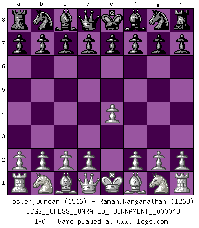 Last move : 1-0 2015 October 27 15:14:15 [Event "FICGS__CHESS__UNRATED_TOURNAMENT__000043"] [Site "FICGS"] [Date "2015.09.17"] [Round "1"] [White "Foster,Duncan"] [Black "Raman,Ranganathan"] [Result "1-0"] [WhiteElo "1516"] [BlackElo "1269"] 1.e4 1-0 This chess game has been lost on time (started : 2015.09.17 11:57:42) King's pawn Opening Player White won this chess game. Follow this game move after move (download)When you absolutely don't know what to do anymore, it is time to panic. (John van der Wiel) Wer wird heute Abend ihr Gegner sein? -- Heute Abend spiele ich gegen die schwarzen Steine. (Akiba Rubinstein) El jugador táctico sabe que hacer cuando hay algo que hacer; mientras que el estratega sabe que hacer cuando no hay nada que hacer. (Gerald Abrahams) Il n'y a plus de joueurs du niveau de Jacob Murray dont la seule quête est le beau jeu, le plaisir de voir les pièces construire quelque chose. Sur 10 idées à la minute, 9 seront sans intérêt, la dernière s'avèrera géniale. (Christian Bauer) Big Chess is a place for big hallucinations. (Thibault de Vassal)