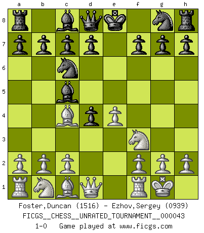 Last move : 1-0 2015 November 2 5:18:51 [Event "FICGS__CHESS__UNRATED_TOURNAMENT__000043"] [Site "FICGS"] [Date "2015.09.17"] [Round "1"] [White "Foster,Duncan"] [Black "Ezhov,Sergey"] [Result "1-0"] [WhiteElo "1516"] [BlackElo "0939"] 1.e4 e5 2.Nf3 Nc6 3.d4 exd4 4.Bc4 Bc5 5.O-O 1-0 This chess game has been lost on time (started : 2015.09.17 11:57:42) Scotch gambit Kingside Castling by player White (move 5) Player White won this chess game. Follow this game move after move (download)Chess is 99 percent tactics. (Teichmann) Nie in meinem Leben habe ich die französische Verteidigung gespielt, welche die Stumpfsinnigste von allen ist. (Wilhelm Steinitz) Evita las multitudes. Haz independientemente tu propio razonamiento. Trata de ser el jugador de Ajedrez, no la pieza de Ajedrez. (Ralph Charell) Je menace de comprendre la position. (Anonyme) The best weapon against an enemy is another enemy. (Friedrich Nietzsche)
