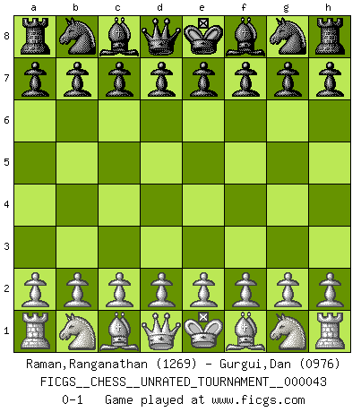 Last move : 0-1 2015 October 27 15:14:15 [Event "FICGS__CHESS__UNRATED_TOURNAMENT__000043"] [Site "FICGS"] [Date "2015.09.17"] [Round "1"] [White "Raman,Ranganathan"] [Black "Gurgui,Dan"] [Result "0-1"] [WhiteElo "1269"] [BlackElo "0976"] 0-1 This chess game has been lost on time (started : 2015.09.17 11:57:42) Player Black won this chess game. Follow this game move after move (download)What would Chess be without silly mistakes ? (Kurt Richter) Die jungen Leute sollen verstehen, dass sie noch etwas von mir lernen können und müssen. (Viktor Kortschnoi) Yo adoro todas la posiciones. Denme una partida posicional difícil, y la jugaré. Pero posiciones totalmente ganadas, no las tolero. (Hein Donner) Le joueur d'Echecs qui veut atteindre le top est obligé de développer son propre credo créatif. Alexeï Stepanovicth Souétine. Il est facile d'écrire des livres ! Ce qui est difficile, c'est de jouer ! (Alexeï Stepanovicth Souétine) A mistake is only a mistake if you let it happen twice. Otherwise it is a learning experience. (Daniel Parmet)