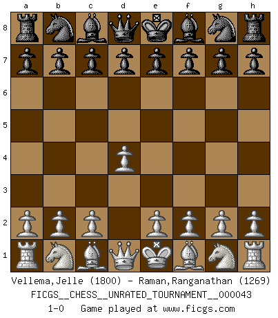Last move : 1-0 2015 October 28 3:34:40 [Event "FICGS__CHESS__UNRATED_TOURNAMENT__000043"] [Site "FICGS"] [Date "2015.09.17"] [Round "1"] [White "Vellema,Jelle"] [Black "Raman,Ranganathan"] [Result "1-0"] [WhiteElo "1800"] [BlackElo "1269"] 1.d4 1-0 This chess game has been lost on time (started : 2015.09.17 11:57:42) Queen's pawn Player White won this chess game. Follow this game move after move (download)Help your pieces so they can help you. (Paul Morphy) Schach ist das Spiel, das die Verrückten gesund hält. (Albert Einstein) Juega la Apertura como un libro, el Juego Medio como un mago y los Finales como una máquina. (Spielmann) Demandez au pauvre Cg1 ce qu'il en pense. Eduard Gufeld à propos de la variante Saemisch de l'Est-Indienne. Life is verb, not a noun. (Charlotte Perkins Gilman)
