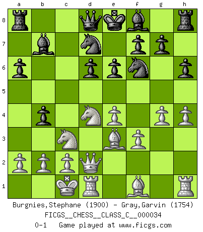 Last move : 0-1 2007 July 5 15:54:57 [Event "FICGS__CHESS__CLASS_C__000034"] [Site "FICGS"] [Date "2007.03.11"] [Round "1"] [White "Burgnies,Stephane"] [Black "Gray,Garvin"] [Result "0-1"] [WhiteElo "1900"] [BlackElo "1754"] 1.e4 c5 2.Nf3 d6 3.d4 cxd4 4.Nxd4 Nf6 5.Nc3 a6 6.Be3 e6 7.f3 b5 8.g4 h6 9.Qd2 Nbd7 10.O-O-O Bb7 11.h4 b4 0-1 This chess game has been lost on time (started : 2007.03.11 19:54:18) Sicilian : Najdorf, Byrne (English) attack Queenside Castling by player White (move 10) Player Black won this chess game. Follow this game move after move (download)A player surprised is half beaten. (Proverb) Gott hat gewollt, dass ich Champion werde. (Surab Azmajparaschvili) Una buena ofensiva y una buena defensa, comienzan ambas con un buen desarrollo. (Bruce A. Moon) La menace est plus forte que l'exécution. (Aaron Nimzovitch) The question of whether computers can think is just like question of whether submarines can swim. (Edsger W. Dijkstra)