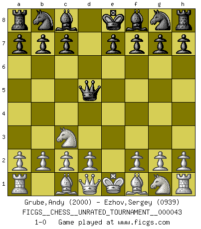Last move : 1-0 2015 November 1 5:6:47 [Event "FICGS__CHESS__UNRATED_TOURNAMENT__000043"] [Site "FICGS"] [Date "2015.09.17"] [Round "1"] [White "Grube,Andy"] [Black "Ezhov,Sergey"] [Result "1-0"] [WhiteElo "2000"] [BlackElo "0939"] 1.e4 d5 2.exd5 Qxd5 3.Nc3 1-0 This chess game has been lost on time (started : 2015.09.17 11:57:42) Scandinavian (centre counter) defense Player White won this chess game. Follow this game move after move (download)I played Chess with him and would have beaten him sometimes only he always took back his last move, and ran the game out differently. (Mark Twain) Schach verlangt totale Konzentration. (Robert James Fischer) No volvere nunca a jugar contigo. Has insultado a mi amigo. - cuando un oponente se maldijo por una mala jugada (Miguel Najdorf) Lorsque vous vous retrouvez devant une position atroce, ne tendez pas un ultime piège dérisoire avec l'intention d'abandonner si l'adversaire le déjoue ! Faites-vous plutôt un devoir de résister comme si votre vie en dépendait. Jouez le coup qui vous déplairait au centuple si vous étiez dans la peau de votre tortionnaire ! Perfection is achieved, not when there is nothing more to add, but when there is nothing left to take away. (Antoine de Saint-Exupéry)
