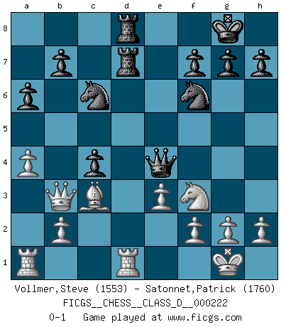 Last move : 0-1 2015 November 11 23:22:58 [Event "FICGS__CHESS__CLASS_D__000222"] [Site "FICGS"] [Date "2015.09.18"] [Round "1"] [White "Vollmer,Steve"] [Black "Satonnet,Patrick"] [Result "0-1"] [WhiteElo "1553"] [BlackElo "1760"] 1.d4 d5 2.c4 dxc4 3.e3 Nf6 4.Bxc4 e6 5.Nf3 c5 6.O-O a6 7.a4 Nc6 8.Nc3 Be7 9.d5 exd5 10.Nxd5 O-O 11.Nxe7+ Qxe7 12.Bd2 Be6 13.Qc2 Bxc4 14.Qxc4 Rfd8 15.Rfd1 Rd7 16.Qc2 Rad8 17.Bc3 Qe4 18.Qb3 c4 0-1 Queen's gambit accepted Kingside Castling by player White (move 6) Kingside Castling by player Black (move 10) Player Black won this chess game. Follow this game move after move (download)Examine moves that smite! A good eye for smites is far more important than a knowledge of strategical principles. (Purdy) Schach ist ein Teil der Kultur, und wenn es mit der Kultur abwärts geht, geht es auch mit dem Schach abwärts. (Mikhail Moiseyevich Botvinik) El Ajedrez te enseña a controlarl la excitación inicial que sientes cuando vez algo que parece bueno y te enseña a pensar objetivamente cuando te encuentras en problemas. (Stanley Kubrick) J'ai toujours senti une vague pitié pour l'homme qui ne connaît rien aux échecs, tout comme j'en aurais pour un homme ignorant de l'amour. Les Echecs, comme la musique ou comme l'amour, ont le pouvoir de rendre heureux. (Siegbert Tarrasch) Memory... is the diary that we all carry with us. (Oscar Wilde, The Importance of Being Earnest)