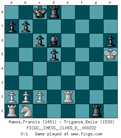 Last move : 0-1 2015 October 1 11:22:28 [Event "FICGS__CHESS__CLASS_D__000222"] [Site "FICGS"] [Date "2015.09.18"] [Round "1"] [White "Ramos,Francis"] [Black "Trigance,Emile"] [Result "0-1"] [WhiteElo "1451"] [BlackElo "1533"] 1.e4 c6 2.d4 d5 3.e5 Bf5 4.g4 Be4 5.f3 Bg6 6.h4 h5 7.e6 Qd6 8.exf7+ Bxf7 9.Be3 e5 10.Qd2 exd4 11.Qxd4 Nd7 12.Bf4 Qe6+ 13.Be2 Nh6 14.Qe3 hxg4 15.Qxe6+ Bxe6 16.Bxh6 gxh6 17.fxg4 Ne5 18.Nh3 Nxg4 19.Nf4 Bf5 20.Kd2 Nf2 21.Rf1 Ne4+ 22.Ke3 Ng3 23.Re1 O-O-O 24.Kf3 Nxe2 25.Rxe2 Be4+ 26.Kg4 Bd6 27.h5 Rhg8+ 28.Ng6 Bxg6 29.hxg6 Rxg6+ 30.Kh5 Rg1 0-1 Caro-Kann : Advance variation Queenside Castling by player Black (move 23) Player Black won this chess game. Follow this game move after move (download)Your body has to be in top condition. Your Chess deteriorates as your body does. You can't separate body from mind. (Bobby Fischer) Ich verachte die Medien. (Robert James Fischer) Yo adoro todas la posiciones. Denme una partida posicional difícil, y la jugaré. Pero posiciones totalmente ganadas, no las tolero. (Hein Donner) Vous savez, camarade Pachman, je n'éprouve pas de plaisir à être ministre, je jouerais plutôt aux échecs comme vous, ou alors ferais une révolution au Venezuela. (Che Guevara à Ludek Pachman, 'Checkmate in Prague', 1975) I'm extremely disappointed. I send you out for exciting, new designer drugs, you come back with tomato sauce. (Gregory House, House M.D.)