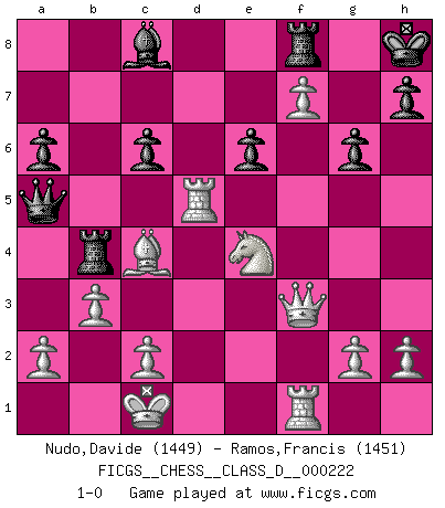 Last move : 1-0 2015 October 1 17:28:2 [Event "FICGS__CHESS__CLASS_D__000222"] [Site "FICGS"] [Date "2015.09.18"] [Round "1"] [White "Nudo,Davide"] [Black "Ramos,Francis"] [Result "1-0"] [WhiteElo "1449"] [BlackElo "1451"] 1.e4 c5 2.Nf3 d6 3.d4 cxd4 4.Nxd4 Nf6 5.Nc3 a6 6.Bg5 e6 7.Qf3 Be7 8.O-O-O Qc7 9.Qg3 O-O 10.f4 Nc6 11.Nxc6 bxc6 12.e5 dxe5 13.fxe5 Nd5 14.Bh6 g6 15.Ne4 Rd8 16.Bc4 Rb8 17.Rhf1 Rb4 18.b3 Qa5 19.Qf3 f5 20.exf6 Bf8 21.f7+ Kh8 22.Bxf8 Rxf8 23.Rxd5 1-0 Sicilian : Najdorf, 6...e6 Queenside Castling by player White (move 8) Kingside Castling by player Black (move 9) Player White won this chess game. Follow this game move after move (download)In life, as in Chess, one's own Pawns block one's way. A man's very wealth, ease, leisure, children, books, which should help him to win, more often checkmate him. (Charles Buxton) Ich habe Putins Aufstieg an die Macht beobachtet und seine Politik, die demokratischen Institutionen meines Landes zu zerstören. (Garry Kasparov) El Ajedrez expande y enriquece tu mente. (Saudin Robovic) La vie est comme un jeu d'échecs : nous esquissons un plan, mais celui-ci est tributaire de ce que daignent faire l'adversaire aux échecs et le destin dans la vie. (Arthur Schopenhauer) I don't know, I don't care, and it doesn't make any difference. (Albert Einstein)