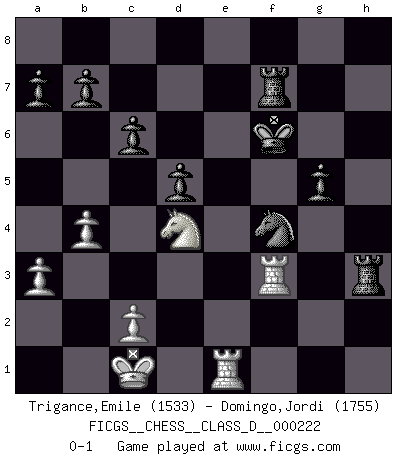 Last move : 0-1 2015 November 26 17:54:56 [Event "FICGS__CHESS__CLASS_D__000222"] [Site "FICGS"] [Date "2015.09.18"] [Round "1"] [White "Trigance,Emile"] [Black "Domingo,Jordi"] [Result "0-1"] [WhiteElo "1533"] [BlackElo "1755"] 1.e4 e5 2.Nf3 f5 3.Nxe5 Qf6 4.Nc4 fxe4 5.Nc3 Qe6 6.Ne3 c6 7.d3 Bb4 8.dxe4 Nf6 9.Bd2 Nxe4 10.Nxe4 Qxe4 11.Bd3 Bxd2+ 12.Qxd2 Qe5 13.O-O-O O-O 14.Rhe1 Qf6 15.Re2 d5 16.Rde1 Nd7 17.Ng4 Qh4 18.h3 Nc5 19.Ne5 Bf5 20.Bxf5 Rxf5 21.Nf3 Qf4 22.Qxf4 Rxf4 23.Nd2 Rf6 24.g3 Raf8 25.f4 h5 26.b4 Na6 27.a3 h4 28.gxh4 Rxf4 29.Re7 R8f7 30.Re8+ Kh7 31.R1e5 Nc7 32.Rh5+ Kg6 33.Rg5+ Kf6 34.Re1 Rxh4 35.Rg3 Ne6 36.Rf3+ Nf4 37.Nb3 g5 38.Nd4 Rxh3 0-1 Latvian counter-gambit Queenside Castling by player White (move 13) Kingside Castling by player Black (move 13) Player Black won this chess game. Follow this game move after move (download)Chess holds its master in its own bonds, shackling the mind and brain so that the inner freedom of the very strongest must suffer. (Albert Einstein) Kleine Schachspieler machen Mist, und große Schachspieler machen Mist, aber große machen weniger Mist. (Fritz Sämisch) Cuando veas una buena jugada, trata de encontrar otra mejor. (Emanuel Lasker) Le jeu d'échecs est comme rejeté hors du temps. (Antoine de Saint-Exupéry) The right perception of any matter and a misunderstanding of the same matter do not wholly exclude each other. (Kafka's the trial)