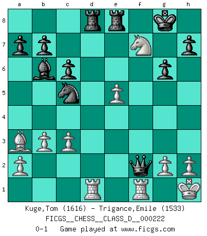 Last move : 0-1 2015 October 3 18:12:48 [Event "FICGS__CHESS__CLASS_D__000222"] [Site "FICGS"] [Date "2015.09.18"] [Round "1"] [White "Kuge,Tom"] [Black "Trigance,Emile"] [Result "0-1"] [WhiteElo "1616"] [BlackElo "1533"] 1.e4 c6 2.Be2 d5 3.d3 e5 4.Nd2 Nf6 5.f4 Bd6 6.fxe5 Bxe5 7.Ngf3 Bc7 8.c3 dxe4 9.Nxe4 Nxe4 10.dxe4 Qe7 11.Qc2 Nd7 12.O-O Nc5 13.Bc4 Be6 14.Bxe6 Qxe6 15.b3 O-O 16.Ba3 Bb6 17.Kh1 Rfe8 18.e5 Rad8 19.Rad1 Qc8 20.Ng5 g6 21.Qf2 Qf5 22.Nxf7 Qxf2 0-1 Caro-Kann defense Kingside Castling by player White (move 12) Kingside Castling by player Black (move 15) Player Black won this chess game. Follow this game move after move (download)The stomach is an essential part of the Chess master. (Bent Larsen) Im Wettkampf zwischen starken Meistern kommen Fehler sehr selten vor, deshalb ist es mit bloßem Warten nicht getan. (José Raúl Capablanca) La táctica fluye a partir de una posición superior. (Bobby Fischer) Demandez au pauvre Cg1 ce qu'il en pense. Eduard Gufeld à propos de la variante Saemisch de l'Est-Indienne. Winning isn't everything... but losing is nothing. (Mednis)
