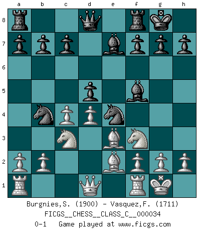 Last move : 0-1 2007 June 25 14:51:49 [Event "FICGS__CHESS__CLASS_C__000034"] [Site "FICGS"] [Date "2007.03.11"] [Round "1"] [White "Burgnies,Stephane"] [Black "Vasquez,Fernando"] [Result "0-1"] [WhiteElo "1900"] [BlackElo "1711"] 1.e4 e5 2.Nf3 Nf6 3.Nxe5 d6 4.Nf3 Nxe4 5.d4 d5 6.Bd3 Nc6 7.O-O Be7 8.c4 Nb4 9.Be2 O-O 10.Nc3 Be6 11.Be3 Bf5 0-1 This chess game has been lost on time (started : 2007.03.11 19:54:18) Petrov : Classical attack Kingside Castling by player White (move 7) Kingside Castling by player Black (move 9) Player Black won this chess game. Follow this game move after move (download)For surely of all the drugs in the world, Chess must be the most permanently pleasurable. (Assiac) Schach ist Kampf, hauptsächlich jedoch gegen die eigenen Fehler. (Savielly Grigorievitsch Tartakower) Los Peones son el alma de una partida de Ajedrez. (Francois Andre Danican Philidor) Plusieurs personnes se sont demandées comment Tal faisait pour gagner... En fait, c'est très simple ! Il met ses pièces au centre de l'échiquier et les sacrifie quelque part ! (David Bronstein) All politicians must be presumed guilty until they are proven innocent. (Dinesh De Silva)