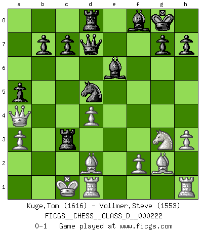 Last move : 0-1 2015 September 26 21:36:29 [Event "FICGS__CHESS__CLASS_D__000222"] [Site "FICGS"] [Date "2015.09.18"] [Round "1"] [White "Kuge,Tom"] [Black "Vollmer,Steve"] [Result "0-1"] [WhiteElo "1616"] [BlackElo "1553"] 1.c4 e5 2.Nc3 Nf6 3.d3 Bc5 4.e3 Nc6 5.Be2 O-O 6.a3 a5 7.g4 d5 8.cxd5 Nxd5 9.Ne4 Be7 10.Ng3 Be6 11.Bd2 Qd7 12.h3 f6 13.Bf3 Rfd8 14.Be4 Bf8 15.N1e2 Nce7 16.Qc2 f5 17.gxf5 Nxf5 18.O-O-O Nd6 19.Bg2 Ra6 20.d4 Rc6 21.Nc3 exd4 22.exd4 Nb5 23.Qa4 Nbxc3 24.bxc3 Rxc3+ 0-1 English Opening Kingside Castling by player Black (move 5) Queenside Castling by player White (move 18) Player Black won this chess game. Follow this game move after move (download)Nowadays, when you're not a grandmaster at 14, you can forget about it. (Anand Viswanathan) Es war undenkbar für die Behörden, dass ein sowjetischer Großmeister auf diese Art und Weise [Fischer-Taimanov 6:0] verliert, ohne dass es eine politischer Erklärung dafür gäbe. (Mark Taimanov) Me gusta decir que Bobby Fischer fue el mejor jugador que jamás haya existido. Pero lo que hizo de Fischer un genio, fue su habilidad de mezclar una frescura y pragmatismo Americano con ideas Rusas acerca de la estrategia. (Bruce Pandolfini) Même un GMI sait rarement calculer sur plus de cinq coups une attaque à sacrifices. (Rudolf Spielmann) The only sure thing about luck is that it will change. (Wilson Mizner)