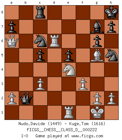 Last move : 1-0 2015 September 30 7:4:8 [Event "FICGS__CHESS__CLASS_D__000222"] [Site "FICGS"] [Date "2015.09.18"] [Round "1"] [White "Nudo,Davide"] [Black "Kuge,Tom"] [Result "1-0"] [WhiteElo "1449"] [BlackElo "1616"] 1.e4 d5 2.e5 b6 3.d4 Ba6 4.Bxa6 Nxa6 5.e6 fxe6 6.Nf3 Nf6 7.O-O g6 8.Re1 Bg7 9.Ng5 O-O 10.Nxe6 Qd7 11.Nxf8 Rxf8 12.f3 c5 13.Qe2 Nb4 14.dxc5 bxc5 15.c3 Nc6 16.Bg5 e5 17.Nd2 Nh5 18.Rad1 Rb8 19.Ne4 Qb7 20.Rxd5 Qxb2 21.Qc4 Kh8 22.Rd6 Rc8 23.Qa6 1-0 Scandinavian (centre counter) defense Kingside Castling by player White (move 7) Kingside Castling by player Black (move 9) Player White won this chess game. Follow this game move after move (download)Chess is a sea in which a gnat may drink and an elephant may bathe. (Hindu proverb) Ich rechne überhaupt nicht voraus. Ich gewinne auch so. (Robert James Fischer) Las ideas audaces son como las piezas del Ajedrez que avanzan hacia adelante. Ellas pueden ser vencidas, pero también pueden iniciar una partida victoriosa. (Goethe) Psychologiquement, tu dois avoir confiance en toi même, mais cette confiance doit être basée sur des faits. (Robert Fischer) Thus, what is of supreme importance in war is to attack the enemy's strategy. (Sun Tzu)