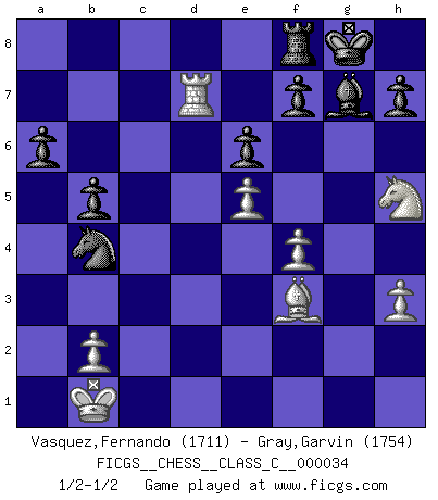 Last move : 1/2-1/2 2007 August 22 11:34:15 [Event "FICGS__CHESS__CLASS_C__000034"] [Site "FICGS"] [Date "2007.03.11"] [Round "1"] [White "Vasquez,Fernando"] [Black "Gray,Garvin"] [Result "1/2-1/2"] [WhiteElo "1711"] [BlackElo "1754"] 1.e4 c5 2.d4 cxd4 3.c3 g6 4.cxd4 d5 5.e5 Nc6 6.Nc3 Nh6 7.Be2 Bg7 8.Nf3 Bg4 9.h3 Bxf3 10.Bxf3 Nf5 11.Bxd5 Nfxd4 12.f4 Qb6 13.Be3 Nc2+ 14.Qxc2 Qxe3+ 15.Ne2 O-O 16.Qb3 Qxb3 17.axb3 Nb4 18.O-O-O Rab8 19.Nc3 e6 20.Bf3 Rfd8 21.Kb1 Nd3 22.g3 g5 23.Rh2 Nc5 24.b4 Rxd1+ 25.Bxd1 Nd3 26.Rd2 Nxb4 27.Rd7 gxf4 28.gxf4 Rf8 29.Ne2 b6 30.Ng3 a6 31.Bf3 b5 32.Nh5 1/2-1/2 Sicilian : Smith-Morra gambit Kingside Castling by player Black (move 15) Queenside Castling by player White (move 18) This chess game ended in a draw. Follow this game move after move (download)Chess is like war on a board. (Bobby Fischer) Das Schachspiel ist ein See, in welchem eine Mücke baden und ein Elefant ertrinken kann. (Emanuel Lasker) Observen a Garry Kasparov. Después de una derrota, invariablemente el gana la próxima partida. Prácticamente hace pedazos a su siguiente oponente. Eso es algo que tenemos que aprender a lograr. (Maurice Ashley) Il n'y a pas eu de défaite parce que je ne crois pas que cet ordinateur ait jamais existé. IBM a triché en refusant d'imprimer les modes de recherche de la machine. C'est évident, pendant le match, des coups décisifs ont été joués par des êtres humains. Aujourd'hui, les meilleurs spécialistes en informatique ne peuvent toujours pas expliquer comment Deep-Blue a pu jouer contre la logique des ordinateurs. IBM a gagné une guerre de communication, mais ils sont incapables de prouver que l'ordinateur a gagné tout seul. (Garry Kasparov) You can only get smarter by playing a smarter opponent. (Revolver, movie)