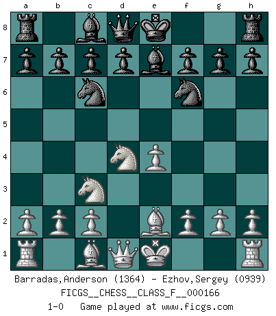 Last move : 1-0 2015 October 30 16:15:34 [Event "FICGS__CHESS__CLASS_F__000166"] [Site "FICGS"] [Date "2015.09.20"] [Round "1"] [White "Barradas,Anderson"] [Black "Ezhov,Sergey"] [Result "1-0"] [WhiteElo "1364"] [BlackElo "0939"] 1.e4 e5 2.Nf3 Nc6 3.d4 exd4 4.Nxd4 Nf6 5.Nc3 Be7 6.Be2 1-0 This chess game has been lost on time (started : 2015.09.20 1:24:40) Scotch : Schmidt variation Player White won this chess game. Follow this game move after move (download)The combination player thinks forward; he starts from the given position, and tries the forceful moves in his mind. (Emanuel Lasker) In der Schule lernt man nichts. Es ist nur Zeitverschwendung. (Robert James Fischer) Un mal plan es mejor que no tener ningún plan. (Frank Marshall) Tous ces prétendus hommes politiques sont les pions, les Cavaliers, les Tours ou les Fous d'une partie d'échecs qui se jouera tant qu'un hasard ne renversera pas l'échiquier. (Honoré de Balzac) No man has ever achieved immortality in his own life time. (Unknown)