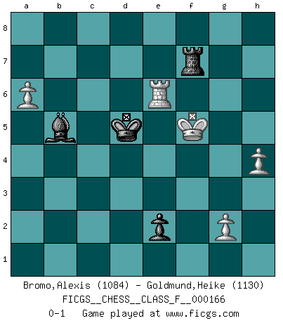 Last move : 0-1 2015 October 25 16:56:45 [Event "FICGS__CHESS__CLASS_F__000166"] [Site "FICGS"] [Date "2015.09.20"] [Round "1"] [White "Bromo,Alexis"] [Black "Goldmund,Heike"] [Result "0-1"] [WhiteElo "1084"] [BlackElo "1130"] 1.d4 d5 2.c4 c6 3.Nc3 Nf6 4.h3 Bf5 5.Nf3 e6 6.a3 Be7 7.e3 O-O 8.b4 Ne4 9.Nxe4 dxe4 10.Ne5 Nd7 11.Nxd7 Qxd7 12.c5 Rfd8 13.Bb2 Bf6 14.Be2 Qe7 15.O-O e5 16.Bg4 Bg6 17.f4 h6 18.f5 Bh7 19.a4 Bg5 20.Qe2 Bf6 21.b5 exd4 22.exd4 Bxd4+ 23.Bxd4 Rxd4 24.Rfd1 Rad8 25.Rxd4 Rxd4 26.Qb2 Qe5 27.bxc6 b6 28.cxb6 Qc5 29.b7 Rb4 30.Qf2 Qxc6 31.Qxa7 Qxb7 32.Qxb7 Rxb7 33.a5 Ra7 34.Kf2 g6 35.fxg6 Bxg6 36.Ke3 f5 37.Be2 Kf7 38.Kf4 Ke6 39.Bc4+ Kd6 40.a6 Kc5 41.Rc1 Kd4 42.Bb5 Kd5 43.Rc6 Be8 44.Rxh6 Bxb5 45.Kxf5 e3 46.Re6 e2 47.h4 Rf7+ 0-1 QGD Slav defense Kingside Castling by player Black (move 7) Kingside Castling by player White (move 15) 10 pieces endgame at move 44 : White KRPPP , Black KRBPP WHITE : King + 1 Rook 3 Pawns BLACK : King + 1 Rook 1 Bishop 2 Pawns 9 pieces endgame at move 45 : White KRPPP , Black KRBP WHITE : King + 1 Rook 3 Pawns BLACK : King + 1 Rook 1 Bishop 1 Pawn Player Black won this chess game. Follow this game move after move (download)Mistrust is the most necessary characteristic of the Chess player. (Siegbert Tarrasch) Irgendwie scheint mir sonntags früh um 9 Uhr der Killerinstinkt verloren gegangen zu sein. (Alexej Shirov) No hay precio que no valga la pena por la cabellera del Rey enemigo. (Koblentz) La tactique est l'élément le plus important du milieu de jeu. (Siegbert Tarrasch) You have to believe in yourself. (Sun Tzu)