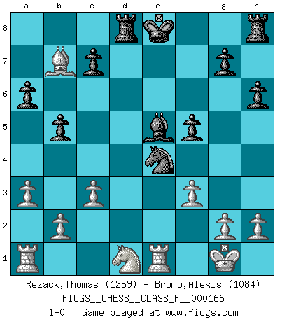 Last move : 1-0 2015 October 12 14:32:21 [Event "FICGS__CHESS__CLASS_F__000166"] [Site "FICGS"] [Date "2015.09.20"] [Round "1"] [White "Rezack,Thomas"] [Black "Bromo,Alexis"] [Result "1-0"] [WhiteElo "1259"] [BlackElo "1084"] 1.e4 e5 2.Nf3 Nc6 3.Bc4 h6 4.a3 a6 5.d4 d6 6.Nc3 b5 7.Bd5 Bb7 8.dxe5 dxe5 9.Nxe5 Nxe5 10.Bxb7 Qxd1+ 11.Nxd1 Rd8 12.O-O Nf6 13.Bf4 Bd6 14.Bxe5 Bxe5 15.c3 Nxe4 16.Re1 f5 17.f3 1-0 King's pawn game Kingside Castling by player White (move 12) Player White won this chess game. Follow this game move after move (download)For surely of all the drugs in the world, Chess must be the most permanently pleasurable. (Assiac) Zu meiner Zeit war ein 20 jähriger ein junger Spieler, heute ist er ein Veteran. (Garry Kasparov) Aquel que ve no otra dirección en el juego que la de dar Jaque Mate a su oponente, nunca será un buen jugador de Ajedrez. (Euwe) Le thème de l'attaque double intervient d'une manière ou d'une autre dans l'immense majorité des combinaisons. (Youri Averbakh) When you stop learning you start dying. (M. Scott Adams)