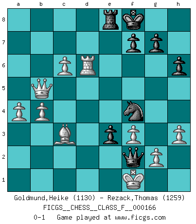 Last move : 0-1 2015 December 7 14:25:8 [Event "FICGS__CHESS__CLASS_F__000166"] [Site "FICGS"] [Date "2015.09.20"] [Round "1"] [White "Goldmund,Heike"] [Black "Rezack,Thomas"] [Result "0-1"] [WhiteElo "1130"] [BlackElo "1259"] 1.d4 Nf6 2.Nf3 d5 3.e3 Bg4 4.Be2 e6 5.O-O c5 6.h3 Bxf3 7.Bxf3 cxd4 8.exd4 Be7 9.Be3 Nc6 10.Nd2 O-O 11.c4 Rc8 12.c5 Qc7 13.Be2 a6 14.Nf3 h6 15.a3 b6 16.Bxa6 Rb8 17.b4 Ne4 18.Qc2 Bf6 19.Nd2 Ne7 20.Nxe4 dxe4 21.Qxe4 bxc5 22.dxc5 Bxa1 23.Bd3 Ng6 24.Rxa1 Rbd8 25.Bf4 Qd7 26.Bd6 Rfe8 27.Rd1 e5 28.Qe2 Qe6 29.Bb5 Ra8 30.a4 e4 31.Bc6 Red8 32.Bxa8 Rxa8 33.Qb5 e3 34.f3 Re8 35.Bg3 Kf8 36.Rd6 Qb3 37.Be1 Nf4 38.c6 Qb1 39.Kf1 Qa2 40.Bc3 Qf2+ 0-1 Queen's pawn game Kingside Castling by player White (move 5) Kingside Castling by player Black (move 10) Player Black won this chess game. Follow this game move after move (download)Chess demands total concentration. (Bobby Fischer) Computer sind die einzigen Gegner, die nicht immer eine Ausrede auf Lager haben, wenn sie gegen mich verlieren. (Robert James Fischer) Ciertamente el estado mental actual de Bobby Fischer es una tragedia. Uno de los mas grandes jugadores de Ajedrez del mundo -el orgullo y pena del Ajedrez Americano. (Frank Brady) La tactique, c'est ce que vous faites quand il y a quelque chose à faire; la stratégie, c'est ce que vous faites quand il n'y a rien à faire. (Savielli Tartacower) Shallow men believe in luck. Strong men belive in cause and effect. (Ralph Waldo Emerson)