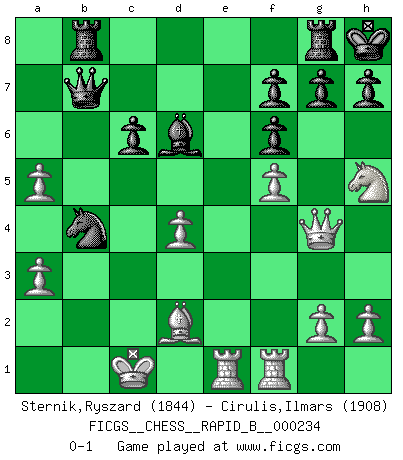 Last move : 0-1 2015 October 15 13:43:39 [Event "FICGS__CHESS__RAPID_B__000234"] [Site "FICGS"] [Date "2015.09.21"] [Round "1"] [White "Sternik,Ryszard"] [Black "Cirulis,Ilmars"] [Result "0-1"] [WhiteElo "1844"] [BlackElo "1908"] 1.d4 c6 2.e4 d5 3.Nc3 dxe4 4.Nxe4 Nf6 5.Nxf6+ exf6 6.Bc4 Bd6 7.Qe2+ Qe7 8.Bd2 Be6 9.O-O-O Bxc4 10.Qxc4 O-O 11.Re1 Qd7 12.Ne2 Re8 13.Qd3 Na6 14.Ng3 Nc7 15.c3 Ne6 16.Nh5 b5 17.f4 b4 18.Qg3 Kh8 19.Qg4 Rg8 20.cxb4 Qb7 21.f5 Nc7 22.a3 a5 23.bxa5 Nd5 24.Rhf1 Rab8 25.b4 Nxb4 0-1 Queen's pawn Queenside Castling by player White (move 9) Kingside Castling by player Black (move 10) Player Black won this chess game. Follow this game move after move (download)White lost because he failed to remember the right continuation and had to think up the moves himself. (Siegbert Tarrasch) Wenn du nicht weißt was du tun sollst, warte bis dein Gegner eine Idee hat. Sie wird sicher schlecht sein. (Siegbert Tarrasch) No hay precio que no valga la pena por la cabellera del Rey enemigo. (Koblentz) Même si vous avez un bon coup à faire, regardez toujours s'il n'y en a pas un qui lui soit préférable. (Pedro Damiano) If we don't succeed, we run the risk of failure. (George W. Bush)