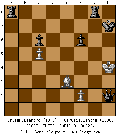 Last move : 0-1 2015 October 14 21:7:42 [Event "FICGS__CHESS__RAPID_B__000234"] [Site "FICGS"] [Date "2015.09.21"] [Round "1"] [White "Zatiek,Leandro"] [Black "Cirulis,Ilmars"] [Result "0-1"] [WhiteElo "1800"] [BlackElo "1908"] 1.e4 c6 2.d4 d5 3.Nc3 dxe4 4.Nxe4 Nf6 5.Nxf6+ exf6 6.Nf3 Bf5 7.Bd3 Bxd3 8.Qxd3 Bd6 9.O-O O-O 10.c4 Qd7 11.Bd2 Rc8 12.Rfe1 Na6 13.c5 Nxc5 14.dxc5 Bxh2+ 15.Kxh2 Qxd3 16.Re3 Qc2 17.Rc1 Qxb2 18.Rb3 Qxa2 19.Rxb7 a5 20.Rcb1 a4 21.R1b2 Qd5 22.Re7 a3 23.R2b7 a2 24.Rxf7 Qh5+ 25.Kg3 a1Q 26.Rxg7+ Kh8 27.Rxh7+ Qxh7 28.Rxh7+ Kxh7 29.Be3 Rg8+ 30.Kh3 Qh1+ 31.Nh2 Qxg2+ 32.Kh4 Qxh2+ 0-1 Caro-Kann : Tartakower (Nimzovich) variation Kingside Castling by player White (move 9) Kingside Castling by player Black (move 9) Promotion Queen by player Black (move 25) 10 pieces endgame at move 32 : White KBPP , Black KQRRPP WHITE : King + 1 Bishop 2 Pawns BLACK : King + 1 Queen 2 Rooks 2 Pawns Player Black won this chess game. Follow this game move after move (download)I prefer to lose a really good game than to win a bad one. (David Levy) Die Auseinandersetzung mit Karpow war politisch geprägt. Er stand für das kommunistische System, wurde von dessen Repräsentanten gehätschelt. Ich war der Oppositionelle. Jeder Schachweltmeister spiegelt auch die gesellschaftlichen Verhältnisse wider. Kramnik steht für die Börsen-Generation des Neuen Markts, ideologiefrei, zahlenfixiert. (Garry Kasparov) El jugador táctico debe saber que hacer cuando algo se debe de hacer. El estratégico debe saber que hacer cuando nada se debe de hacer. (Savielly Tartakover) Les Echecs sont et restent toujours un combat, un combat intégral comme la boxe, la lutte ou un autre sport, et où il doit y avoir un vainqueur et un vaincu. (Joseph Emil Diemer) Success without honor is an unseasoned dish; it will satisfy your hunger, but it won't taste good. (Joe Paterno)