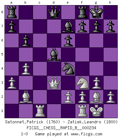 Last move : 1-0 2015 December 4 7:57:37 [Event "FICGS__CHESS__RAPID_B__000234"] [Site "FICGS"] [Date "2015.09.21"] [Round "1"] [White "Satonnet,Patrick"] [Black "Zatiek,Leandro"] [Result "1-0"] [WhiteElo "1760"] [BlackElo "1800"] 1.Nf3 Nf6 2.c4 e6 3.g3 Nc6 4.Bg2 d5 5.O-O Be7 6.d4 O-O 7.b3 b6 8.Bb2 Bb7 9.Nbd2 Nb4 10.a3 Na6 11.Rc1 c5 12.cxd5 Bxd5 13.dxc5 Nxc5 14.b4 Nce4 15.Nxe4 Nxe4 16.Qd3 1-0 This chess game has been lost on time (started : 2015.09.21 12:28:10) Reti Opening Kingside Castling by player White (move 5) Kingside Castling by player Black (move 6) Player White won this chess game. Follow this game move after move (download)In Chess, just as in life, today's bliss may be tomorrow's poison. (Assaic) In der Schule lernt man nichts. Es ist nur Zeitverschwendung. (Robert James Fischer) Los libros de Ajedrez deben de usarse igual como usamos los anteojos: para mejorar la vista, aunque algunos jugadores los quieren usar como si ellos les otorgaran la vision. (José Raúl Capablanca) Toutes choses étant égales, c'est la conviction qui gagne. Alliée à une volonté de vaincre, elle sert de détonateur, suscite des idées, disperse les doutes et aide à penser clairement. (Robert Fischer) You must do what you feel is right... of course. (Obi-Wan Kenobi in Star Wars ep.4)