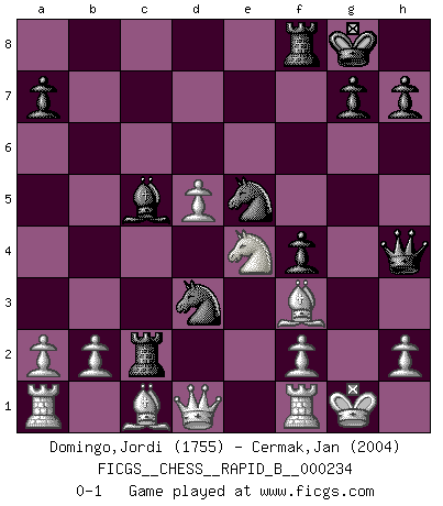 Last move : 0-1 2015 December 9 22:55:11 [Event "FICGS__CHESS__RAPID_B__000234"] [Site "FICGS"] [Date "2015.09.21"] [Round "1"] [White "Domingo,Jordi"] [Black "Cermak,Jan"] [Result "0-1"] [WhiteElo "1755"] [BlackElo "2004"] 1.g4 d5 2.Bg2 Bxg4 3.c4 c6 4.Qb3 e6 5.cxd5 exd5 6.Qxb7 Nd7 7.Nc3 Rc8 8.d4 Bd6 9.e4 Ne7 10.exd5 Nb6 11.dxc6 O-O 12.Bg5 f6 13.Be3 Rc7 14.Qa6 Nxc6 15.Nf3 f5 16.d5 Nb4 17.Qe2 Nc4 18.O-O Ne5 19.Nb5 Rc2 20.Qd1 f4 21.Bc1 Bc5 22.Nc3 Bxf3 23.Bxf3 Qh4 24.Ne4 Nbd3 0-1 Grob : Fritz gambit Kingside Castling by player Black (move 11) Kingside Castling by player White (move 18) Player Black won this chess game. Follow this game move after move (download)A great player and a great example for many. His book My 60 Memorable Games had a big impact on me. It is a shame he didn't continue to enrich the world of chess with his unparalleled understanding after 1972. (Jan Timman, about Bobby Fischer's death) Nach Morphy wurde nichts neues mehr in der Behandlung offener Positionen gefunden. (Mikhail Moiseyevich Botvinik) Cuando tu casa esta en llamas, no puedes ser molestado por tus vecinos. O, como decinos en Ajedrez, si tu Rey esta bajo ataque, no te preocupa perder un Peón del lado de la Reina. (Gary Kasparov) A chaque perte on perd un peu de soi. (Joël Lautier) There are two major products that came out of Berkeley: LSD and UNIX. We do not believe this is to be a coincidence. (Jeremy S. Anderson)