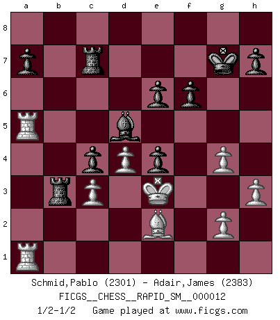 Last move : 1/2-1/2 2016 January 3 0:8:44 [Event "FICGS__CHESS__RAPID_SM__000012"] [Site "FICGS"] [Date "2015.09.21"] [Round "1"] [White "Schmid,Pablo"] [Black "Adair,James"] [Result "1/2-1/2"] [WhiteElo "2301"] [BlackElo "2383"] 1.d4 Nf6 2.c4 e6 3.Nf3 d5 4.Nc3 Be7 5.Bf4 O-O 6.e3 Nbd7 7.c5 Ne4 8.Rc1 Nxc3 9.bxc3 c6 10.Qa4 g5 11.Bd6 Bxd6 12.cxd6 g4 13.Ne5 f6 14.Nxd7 Qxd7 15.Qa3 Rd8 16.h3 g3 17.fxg3 Qxd6 18.Qxd6 Rxd6 19.g4 Kg7 20.a4 b6 21.Rb1 c5 22.Kf2 c4 23.e4 dxe4 24.Rb4 Bb7 25.a5 Rc8 26.Ke3 Bd5 27.Be2 bxa5 28.Ra4 Rc7 29.Rxa5 Rb6 30.Rha1 Rb3 1/2-1/2 James Adair Thanks for an interesting game. 9. bxc3 was a very crafty idea which I must say I'd overlooked in my prep for this variation. I think the response I found was quite reliable but other tries feel risky for Black Pablo Schmid Thanks for your comment, I have seen that 9.Rxc3 has been play at top level but I couldn't find anything for White, so I have tried an improvised novelty, but the surprising 10..g5! was good and you equalized with ease after some precises moves! James Adair Agreed! It'll be interesting to see how the Bf4 lines in the QGD develop in the future. Best of luck for your remaining games :) Queen's pawn game Kingside Castling by player Black (move 5) This chess game ended in a draw. Follow this game move after move (download)Fischer is under obligation to nobody. (Joseph Platz) Man gibt nur Pakete auf. (Paul Keres) Nunca nadie ha ganado una partida de Ajedrez rindiendose. (Unknown) Les ravages du H expliquent la différence de niveau entre Tal et Thal [Abergel]. We're missing something. (Gregory House, House M.D.)