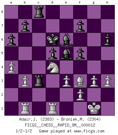 Last move : 1/2-1/2 2016 January 2 20:35:0 [Event "FICGS__CHESS__RAPID_SM__000012"] [Site "FICGS"] [Date "2015.09.21"] [Round "1"] [White "Adair,James"] [Black "Broniek,Mariusz Maciej"] [Result "1/2-1/2"] [WhiteElo "2383"] [BlackElo "2304"] 1.d4 d5 2.c4 c6 3.Nf3 Nf6 4.e3 e6 5.Nbd2 c5 6.cxd5 exd5 7.b3 cxd4 8.Nxd4 Nc6 9.Bb2 Nxd4 10.Bxd4 a6 11.Bd3 Bd6 12.h3 O-O 13.Qf3 Re8 14.O-O Be6 15.Bxf6 Qxf6 16.Qxf6 gxf6 17.Nf3 f5 18.Rfd1 Rad8 19.g3 Kg7 20.Nd4 Kf6 21.Bf1 Rc8 22.Bg2 Be5 23.a4 Rc3 24.Rab1 Rec8 25.Bf3 h6 26.Kg2 Ke7 27.Kf1 Kd6 28.Kg1 Ke7 29.Kg2 Kd6 30.Kg1 1/2-1/2 QGD Slav : 4.e3 Kingside Castling by player Black (move 12) Kingside Castling by player White (move 14) This chess game ended in a draw. Follow this game move after move (download)A bad day of Chess is better than any good day at work. (Anonymous) Jeder Fehler erscheint unglaublich dumm, wenn andre ihn begehen. (Georg Christoph Lichtenberg) Un mal día en el Ajedrez, es mejor que cualquier buen día en el trabajo. (Anonymous) L'attaque fait le spectacle, la défense gagne les matchs. (Dicton footballistique) Luck never gives; it only lends. (Swedish proverb)