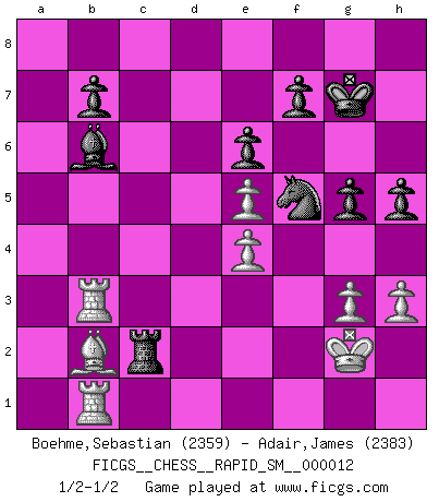 Last move : 1/2-1/2 2016 January 7 21:34:40 [Event "FICGS__CHESS__RAPID_SM__000012"] [Site "FICGS"] [Date "2015.09.21"] [Round "1"] [White "Boehme,Sebastian"] [Black "Adair,James"] [Result "1/2-1/2"] [WhiteElo "2359"] [BlackElo "2383"] 1.e4 e6 2.d4 d5 3.Nc3 Bb4 4.e5 c5 5.a3 Ba5 6.b4 cxd4 7.Qg4 Kf8 8.Nb5 Bb6 9.Nf3 Nc6 10.Bb2 Nge7 11.Nbxd4 h5 12.Qf4 Ng6 13.Nxc6 Nxf4 14.Nxd8 Bxd8 15.g3 Ng6 16.Bd3 Ne7 17.O-O g6 18.b5 Kg7 19.a4 a6 20.Kg2 Bd7 21.c4 dxc4 22.Bxc4 Bb6 23.Rfd1 Rhd8 24.Ng5 axb5 25.axb5 Rac8 26.Bd3 Nf5 27.Ne4 Be8 28.h3 g5 29.Rab1 Rxd3 30.Rxd3 Bxb5 31.Rb3 Bc6 32.f3 Bxe4 33.fxe4 Rc2+ 1/2-1/2 James Adair Thanks for the game! I actually regretted venturing down this 5..Ba5 line as I hadn't really analysed the endgame in any detail. During the game, I felt that Black has a very unpleasant defensive task particularly after the strong 20.Kg2! and perhaps you could have tortured me by refraining from 21.c4 (tempting I admit, but I think White should only open up the position when there's a serious tangible advantage to be gained) and perhaps just keeping a grip on the position with something like 21.h3, slowly building up. It's certainly a defensible position for Black but it's hard to play and I may have had problems holding. Quite an interesting game to analyse in any case! George Jempty This game followed the following until Black's 17th: https://www.iccf.com/MakeAMove I always thought Black had vastly improved on other earlier reckless ideas such as 10...f6?! from Firman-Lputian 2005 James Adair Agreed, 10..f6 is definitely not the way to go. I think the whole position starting from around move 17 is the critical test of this Ba5 winawer but I'm not convinced it's an easy ride for Black. French : Winawer, Advance, 5.a3 Kingside Castling by player White (move 17) This chess game ended in a draw. Follow this game move after move (download)Let the perfectionist play postal. (Yasser Seirawan) Der Freibauer hat für mich eine Seele, genau wie der Mensch, Wünsche, die unerkannt in ihm schlummern, und Befürchtungen, von deren Existenz er selbst kaum ahnt. (Aaron Nimzowitsch) El Ajedrez es parte de la cultura, y si una cultura esta en decadencia, entonces también el Ajedrez declinará. (Mikhail Botvinnik) Avant la finale, les dieux ont créé le milieu de partie. (Tarrasch) A good book on your shelf is a friend that turns its back on you and remains a friend. (Author unknown)
