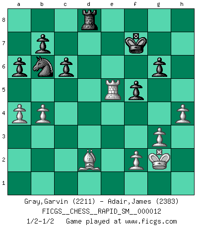 Last move : 1/2-1/2 2016 January 6 0:34:35 [Event "FICGS__CHESS__RAPID_SM__000012"] [Site "FICGS"] [Date "2015.09.21"] [Round "1"] [White "Gray,Garvin"] [Black "Adair,James"] [Result "1/2-1/2"] [WhiteElo "2211"] [BlackElo "2383"] 1.c4 e6 2.d4 d5 3.Nc3 Be7 4.cxd5 exd5 5.e3 Nf6 6.Bd3 O-O 7.Nf3 Bg4 8.h3 Bh5 9.O-O c6 10.Qc2 Bg6 11.Bxg6 hxg6 12.Re1 Nbd7 13.Bd2 Re8 14.e4 dxe4 15.Nxe4 Nxe4 16.Rxe4 Nf6 17.Re3 Nd5 18.Re2 Bf6 19.Rxe8+ Qxe8 20.Qb3 Qd7 21.Re1 Qc7 22.Qc4 Qb6 23.b3 Qc7 24.a4 Qd7 25.Ne5 Qd6 26.b4 a6 27.g3 Bxe5 28.dxe5 Qd7 29.Qg4 Qf5 30.Qxf5 gxf5 31.Kg2 Rd8 32.e6 fxe6 33.Rxe6 Kf7 34.Re5 g6 35.h4 Nb6 1/2-1/2 English Opening Kingside Castling by player Black (move 6) Kingside Castling by player White (move 9) This chess game ended in a draw. Follow this game move after move (download)Every Chess master was once a beginner. (Chernev) Dieses schreckliche Gefühl, dass ich gegen eine Maschine spielte, die niemals Fehler macht, zerschmetterte meinen Widerstand. (Mark Taimanov) El jugador blanco perdió porque fallo en recordar la coreccta continuación y tuvo que pensar por sí mismo las movidas. (Siegbert Tarrasch) Ne tendez aucun piège pour le plaisir ! Ne jouez rien dans l'espoir que l'adversaire réagisse de façon stupide ! Prenez toujours pour acquis que l'adversaire va trouver le meilleur coup ! Ne jouez jamais de coup dans l'espoir que l'adversaire ne voie pas la menace ! Chacun de vos coups doit améliorer la position d'une façon ou d'une autre. A good aphorism is too hard for the tooth of time, and is not worn away with the centuries, although it serves as food for every speech. (Friedrich Nietzsche)
