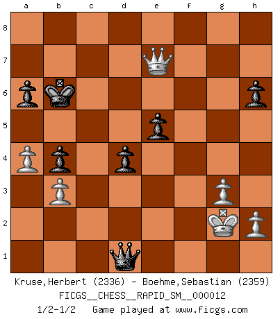 Last move : 1/2-1/2 2016 March 8 11:57:56 [Event "FICGS__CHESS__RAPID_SM__000012"] [Site "FICGS"] [Date "2015.09.21"] [Round "1"] [White "Kruse,Herbert"] [Black "Boehme,Sebastian"] [Result "1/2-1/2"] [WhiteElo "2336"] [BlackElo "2359"] 1.d4 Nf6 2.c4 e6 3.Nf3 d5 4.Nc3 c6 5.e3 Nbd7 6.Bd3 dxc4 7.Bxc4 b5 8.Bd3 Bb7 9.O-O a6 10.e4 c5 11.d5 Qc7 12.dxe6 fxe6 13.Bc2 Bd6 14.Ng5 Nf8 15.f4 O-O-O 16.Qe2 h6 17.Nf3 Bxf4 18.Bxf4 Qxf4 19.g3 Qg4 20.a4 b4 21.Nd1 Kb8 22.Ne3 Qh5 23.Nc4 e5 24.Rad1 Ne6 25.Nd6 Nd4 26.Rxd4 exd4 27.Nxb7 Kxb7 28.Qc4 Rhe8 29.e5 Rxe5 30.Bg6 Qxg6 31.Nxe5 Qe4 32.Qf7+ Kc8 33.Qe6+ Kc7 34.Rxf6 gxf6 35.Qe7+ Kc8 36.Qe6+ Kb7 37.Qe7+ Kc8 38.Qxc5+ Kb7 39.Qe7+ Kc8 40.Qc5+ Kb7 41.Qe7+ Kc8 42.Qe6+ Kc7 43.Qf7+ Kb8 44.Qe7 Qb1+ 45.Kg2 Qc2+ 46.Kf1 fxe5 47.Qxd8+ Kb7 48.Qe7+ Kb6 49.b3 Qd1+ 50.Kg2 1/2-1/2 Queen's pawn game Kingside Castling by player White (move 9) Queenside Castling by player Black (move 15) This chess game ended in a draw. Follow this game move after move (download)A bad plan is better than none at all. (Frank Marshall) Alles was am Schachbrett zählt sind gute Züge. (Robert James Fischer) La partida mas dura de ganar es una partida ganada. (Emanuel Lasker) 'L'échange des dames est un coup dur pour les deux adversaires...' Un journaliste lors d'une partie du match Spassky-Fischer Begin at the beginning and go on till you come to the end; then stop. (Lewis Carrol, Alice in Wonderland)