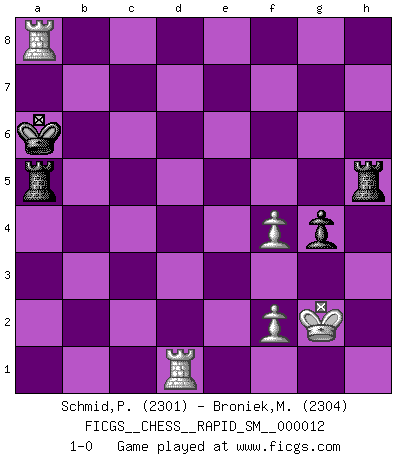 Last move : 1-0 2016 March 4 15:36:15 [Event "FICGS__CHESS__RAPID_SM__000012"] [Site "FICGS"] [Date "2015.09.21"] [Round "1"] [White "Schmid,Pablo"] [Black "Broniek,Mariusz Maciej"] [Result "1-0"] [WhiteElo "2301"] [BlackElo "2304"] 1.d4 d5 2.c4 c6 3.Nf3 Nf6 4.Nc3 e6 5.Bg5 h6 6.Bh4 dxc4 7.e4 g5 8.Bg3 b5 9.Ne5 h5 10.h4 g4 11.Be2 Ba6 12.O-O b4 13.Na4 Nxe4 14.Bf4 Bh6 15.Qc2 Bxf4 16.Qxe4 Bh6 17.Rfd1 Qd5 18.Qc2 Bg7 19.Nc5 Bxe5 20.Nxa6 Bd6 21.Nc5 c3 22.bxc3 a5 23.cxb4 axb4 24.g3 Bxc5 25.dxc5 Qe5 26.Rab1 Na6 27.Bxa6 Rxa6 28.Rxb4 O-O 29.a4 Ra5 30.Rc4 Rfa8 31.R1d4 Qf5 32.Qc3 Rb8 33.Rd1 Qf3 34.Qe1 Rba8 35.R1d4 Qf5 36.Rf4 Qd5 37.Qc1 Qe5 38.Rfe4 Qf6 39.Qe1 Qf3 40.Qa1 Rd8 41.Rcd4 Rb8 42.Re5 Qb3 43.Rxh5 Qb1+ 44.Qxb1 Rxb1+ 45.Kg2 f5 46.Rd8+ Kf7 47.Rd7+ Kg6 48.Rdh7 Kf6 49.R5h6+ Ke5 50.Rd7 Rxc5 51.Re7 Ra1 52.R7xe6+ Kd4 53.h5 Rxa4 54.Re1 R4a5 55.Rhe6 f4 56.Rd1+ Kc4 57.gxf4 Rxh5 58.Rxc6+ Kb5 59.Rc8 Ka6 60.Ra8+ 1-0 QGD Slav : 4.Nc3 Kingside Castling by player White (move 12) Kingside Castling by player Black (move 28) 10 pieces endgame at move 57 : White KRRPP , Black KRRPP WHITE : King + 2 Rooks 2 Pawns BLACK : King + 2 Rooks 2 Pawns 9 pieces endgame at move 58 : White KRRPP , Black KRRP WHITE : King + 2 Rooks 2 Pawns BLACK : King + 2 Rooks 1 Pawn Player White won this chess game. Follow this game move after move (download)It is no time to be playing Chess when the house is on fire. (Italian Proverb) Alle Schachspieler sollten auch ein Hobby haben. (Savielly Grigorievitsch Tartakower) Solo el jugador con la iniciativa tiene el derecho a atacar. (Wilhelm Steinitz) Les sacrifices démontrent seulement que quelqu'un a gaffé. (Savielly Tartacover) The human is the only animal species whose members are able to talk themselves into difficulties that would not otherwise exist. (Wendell Johnson)