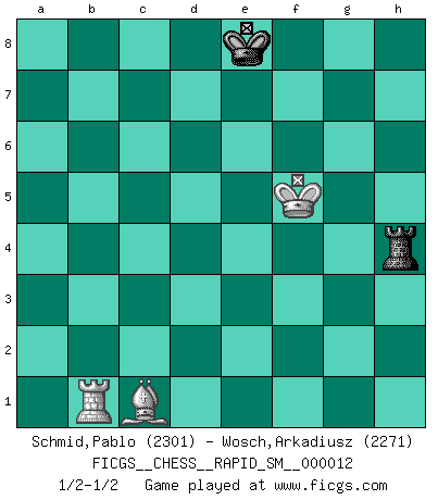 Last move : 1/2-1/2 2016 March 3 20:33:44 [Event "FICGS__CHESS__RAPID_SM__000012"] [Site "FICGS"] [Date "2015.09.21"] [Round "1"] [White "Schmid,Pablo"] [Black "Wosch,Arkadiusz"] [Result "1/2-1/2"] [WhiteElo "2301"] [BlackElo "2271"] 1.d4 Nf6 2.c4 e6 3.Nf3 d5 4.Nc3 c6 5.Bg5 h6 6.Bh4 dxc4 7.e4 g5 8.Bg3 b5 9.Ne5 h5 10.h4 g4 11.Be2 Bb7 12.O-O Nbd7 13.Qc2 Nxe5 14.Bxe5 Bg7 15.b3 cxb3 16.axb3 O-O 17.Bg3 b4 18.Na4 c5 19.Nxc5 Rc8 20.Qd3 Nxe4 21.Nxe4 Qd5 22.f3 Bxd4+ 23.Kh2 Bxa1 24.Rxa1 Qxd3 25.Bxd3 gxf3 26.Nf6+ Kg7 27.Nxh5+ Kh6 28.Ra5 f5 29.Nf4 Rc3 30.Re5 Bc8 31.Nxe6 Rf6 32.Nf4 Rxb3 33.gxf3 Ba6 34.Nd5 Rb2+ 35.Kh1 Bxd3 36.Nxf6 b3 37.Re1 Be2 38.Kg2 Rc2 39.Kh3 Bxf3 40.Be5 a5 41.Rg1 Bg4+ 42.Nxg4+ fxg4+ 43.Kxg4 a4 44.Rd1 b2 45.Rd6+ Kh7 46.Rd7+ Kg8 47.Rg7+ Kf8 48.Rb7 Rc4+ 49.Kf5 a3 50.Bd6+ Ke8 51.Bxa3 b1Q+ 52.Rxb1 Rxh4 53.Bc1 1/2-1/2 Queen's pawn game Kingside Castling by player White (move 12) Kingside Castling by player Black (move 16) 10 pieces endgame at move 42 : White KRBNP , Black KRPPP WHITE : King + 1 Rook 1 Bishop 1 Knight 1 Pawn BLACK : King + 1 Rook 3 Pawns 9 pieces endgame at move 42 : White KRBP , Black KRPPP WHITE : King + 1 Rook 1 Bishop 1 Pawn BLACK : King + 1 Rook 3 Pawns 8 pieces endgame at move 43 : White KRBP , Black KRPP WHITE : King + 1 Rook 1 Bishop 1 Pawn BLACK : King + 1 Rook 2 Pawns 7 pieces endgame at move 51 : White KRBP , Black KRP WHITE : King + 1 Rook 1 Bishop 1 Pawn BLACK : King + 1 Rook 1 Pawn Promotion Queen by player Black (move 51) 6 pieces endgame at move 52 : White KRBP , Black KR WHITE : King + 1 Rook 1 Bishop 1 Pawn BLACK : King + 1 Rook 5 pieces endgame at move 52 : White KRB , Black KR WHITE : King + 1 Rook 1 Bishop BLACK : King + 1 Rook This chess game ended in a draw. Follow this game move after move (download)Pawn endings are to Chess what putting is to golf. (Cecil Purdy) Fischer: 'Remis!?' Uhlmann: 'Aber es muss doch dreimal Zugwiederholung sein!' Fischer: 'Sie nehmen das Remis an, wie ich es sage, sonst spiele ich weiter und werde Sie dann schlagen!' (Robert James Fischer) Uno por uno, yo los acribillé, mi superioridad muy pronto se volvio aparente. (Jose Capablanca) Mais l'homme est une créature légère et illogique : semblable au joueur d'échecs, il n'aime que le processus du but à atteindre, non le but lui-même. (Dostoïevsky) The ego is not master in its own house. (Sigmund Freud)