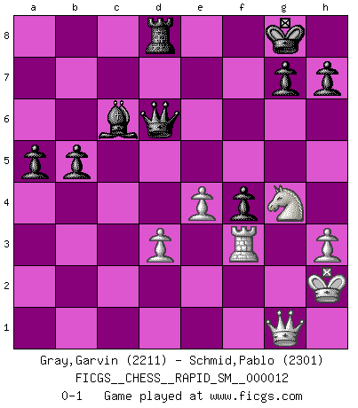 Last move : 0-1 2016 February 16 2:8:24 [Event "FICGS__CHESS__RAPID_SM__000012"] [Site "FICGS"] [Date "2015.09.21"] [Round "1"] [White "Gray,Garvin"] [Black "Schmid,Pablo"] [Result "0-1"] [WhiteElo "2211"] [BlackElo "2301"] 1.c4 e5 2.Nc3 Nf6 3.g3 d5 4.cxd5 Nxd5 5.Bg2 Nb6 6.b3 Be7 7.Bb2 O-O 8.Rc1 f6 9.Nf3 c5 10.O-O Nc6 11.d3 Be6 12.Ne4 Nd7 13.Nfd2 Rc8 14.Nc4 Ndb8 15.Nc3 Qd7 16.Be4 Rcd8 17.Qd2 Na6 18.f4 exf4 19.gxf4 f5 20.Bxc6 Qxc6 21.h3 Bf6 22.Kh2 b5 23.Ne5 Bxe5 24.fxe5 Nc7 25.Qe3 Bd7 26.b4 Ne6 27.a3 Qb7 28.Qg1 Bc6 29.bxc5 Qc7 30.Nd1 Rf6 31.Qf2 Rh6 32.Rg1 Qf7 33.Rc2 f4 34.Qf1 Rh5 35.e4 Ng5 36.Rxg5 Rxg5 37.e6 Qxe6 38.Rg2 Rg3 39.Nf2 Qb3 40.Be5 Qxa3 41.Qg1 Qxc5 42.Rxg3 Qxe5 43.Rf3 a5 44.Ng4 Qd6 0-1 English : Bremen, reverse Dragon Kingside Castling by player Black (move 7) Kingside Castling by player White (move 10) Player Black won this chess game. Follow this game move after move (download)When you don't know what to do, wait for your opponent to get an idea - it's sure to be wrong. (Tarrasch) Es ist peinlich, dass ich nie Weltmeister wurde. Es wäre leicht, Leonid Breschnjew als Ursache vorzuschieben, dessen Apparat den Vorzeigekommunisten Anatoli Karpow in allem unterstützte. Aber Garri Kasparow zum Beispiel, der ebenfalls von den Sowjets unerwünscht war, hat trotz der Widerstände den WM-Titel erobert. (Viktor Kortschnoi) El Ajedrez es imaginación. (David Bronstein) Un millionnaire : 'Monsieur Steinitz ! Vous ne participez aux tournois que pour l'argent, alors que moi je n'y viens que pour l'honneur.' Steinitz : 'Chacun joue pour ce qu'il n'a pas'... Is not life a hundred times too short to bore ourselves ? (Friedrich Nietzsche)