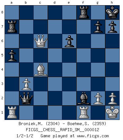 Last move : 1/2-1/2 2016 January 9 23:54:29 [Event "FICGS__CHESS__RAPID_SM__000012"] [Site "FICGS"] [Date "2015.09.21"] [Round "1"] [White "Broniek,Mariusz Maciej"] [Black "Boehme,Sebastian"] [Result "1/2-1/2"] [WhiteElo "2304"] [BlackElo "2359"] 1.e4 e5 2.Nf3 Nc6 3.Bb5 a6 4.Ba4 Nf6 5.O-O Nxe4 6.d4 b5 7.Bb3 d5 8.dxe5 Be6 9.Nbd2 Nc5 10.c3 Be7 11.Bc2 d4 12.Nb3 d3 13.Bb1 Nxb3 14.axb3 Bf5 15.Be3 O-O 16.Nd4 Nxd4 17.cxd4 c5 18.Bxd3 cxd4 19.Bxd4 Qxd4 20.Bxf5 Qxb2 21.Qd5 Rfd8 22.Bd7 Ra7 23.e6 Kh8 24.Qf3 fxe6 25.Bxb5 Bc5 26.Bc4 Rf8 27.Qc6 Bxf2+ 28.Kh1 a5 1/2-1/2 Ruy Lopez : Open, 7.Bb3 Kingside Castling by player White (move 5) Kingside Castling by player Black (move 15) This chess game ended in a draw. Follow this game move after move (download)I guess a certain amount of temperament is expected of Chess geniuses. (Ron Gross) Wie gewinnt Tal? Er entwickelt alle seine Figuren in die Brettmitte und opfert sie dann irgendwo. (Robert James Fischer) Tu sabes que vas a perder. Aún cuando tenía la ventaja, yo sabía que iba a perder. - al estar jugando con Fischer (Andrew Soltis) Le jeu d'échecs fait naître et fortifie en nous plusieurs qualités précieuses dans le cours de l'existence, telles que la prévoyance, la circonspection, la prudence, et la persévérance. (Benjamin Franklin - 1783, la morale des échecs) Thus, what is of supreme importance in war is to attack the enemy's strategy. (Sun Tzu)