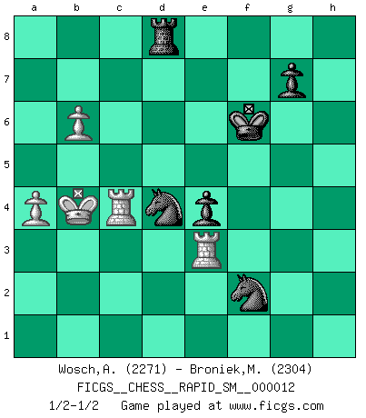 Last move : 1/2-1/2 2016 March 3 7:52:10 [Event "FICGS__CHESS__RAPID_SM__000012"] [Site "FICGS"] [Date "2015.09.21"] [Round "1"] [White "Wosch,Arkadiusz"] [Black "Broniek,Mariusz Maciej"] [Result "1/2-1/2"] [WhiteElo "2271"] [BlackElo "2304"] 1.e4 c5 2.Nf3 d6 3.d4 cxd4 4.Nxd4 Nf6 5.Nc3 a6 6.Be3 e6 7.f3 b5 8.Qd2 Nbd7 9.g4 b4 10.Nce2 h6 11.O-O-O Qc7 12.Qxb4 d5 13.Qc3 Qxc3 14.Nxc3 e5 15.Nc6 d4 16.Na4 dxe3 17.Nb6 Bb7 18.Nxa8 Bxa8 19.Na5 Bb4 20.Nc4 Bc5 21.h4 Bc6 22.Re1 Ke7 23.Nxe3 a5 24.c3 Bxe3+ 25.Rxe3 Ne8 26.Rh2 Nd6 27.Re1 Nc5 28.Kc2 f6 29.Rg2 Be8 30.g5 fxg5 31.hxg5 h5 32.Rd1 Bc6 33.g6 Ne6 34.Rgd2 Rd8 35.b3 Nf4 36.a3 h4 37.a4 h3 38.Bb5 Bb7 39.Bf1 Bc8 40.b4 axb4 41.cxb4 Nxg6 42.b5 Nh4 43.Be2 Be6 44.Kc3 Bg4 45.Kb4 Bxf3 46.Bxf3 Nxf3 47.Rd3 Nd4 48.Rxh3 Nxe4 49.Rc1 Nf2 50.Re3 e4 51.Rc4 Kf6 52.b6 1/2-1/2 Sicilian : Najdorf, Byrne (English) attack Queenside Castling by player White (move 11) This chess game ended in a draw. Follow this game move after move (download)A passed Pawn increases in strength as the number of pieces on the board diminishes. (Capablanca) Jeder Schachmeister war einmal ein Anfänger. (Irving Chernev) La señal de un Gran Maestro es su habilidad de ganar una partida rápidamente y sin dolor. (Irving Chernev) L'action d'une oeuvre littéraire se déroule sur un champ de bataille. Les masques et les types du drame moderne correspondent aux pièces du jeu d'échecs. L'intrigue correspond aux coups et aux gambits, c'est à dire aux techniques du jeu telles qu'utilisées et interprétées par les joueurs. Les tactiques et les péripéties [mouvements] correspondent aux coups exécutés par l'adversaire. (Viktor Shklovsky) Macintosh - we might not get everything right, but at least we knew the century was going to end. (Douglas Adams)