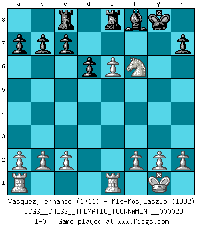 Last move : 1-0 2007 April 22 10:42:15 [Event "FICGS__CHESS__THEMATIC_TOURNAMENT__000028"] [Site "FICGS"] [Date "2007.03.11"] [Round "1"] [White "Vasquez,Fernando"] [Black "Kis-Kos,Laszlo"] [Result "1-0"] [WhiteElo "1711"] [BlackElo "1332"] 1.e4 e6 2.d4 f5 3.exf5 exf5 4.Bd3 d6 5.Nc3 Nf6 6.Nf3 Nc6 7.d5 Ne5 8.O-O Nxd3 9.Qxd3 Be7 10.Nd4 O-O 11.Nxf5 Bxf5 12.Qxf5 Rc8 13.Qe6+ Rf7 14.Be3 Bf8 15.Rfe1 Qd7 16.Bg5 Qxe6 17.dxe6 Re7 18.Bxf6 gxf6 19.Nd5 R7e8 20.Nxf6+ 1-0 French defense Kingside Castling by player White (move 8) Kingside Castling by player Black (move 10) Player White won this chess game. Follow this game move after move (download)Life is a kind of Chess, with struggle, competition, good and ill events. (Benjamin Franklin) Im Hotelzimmer gab es nur zwei Schaben. (Über die Turnierbedingungen) (Peter Swidler) Un buen jugador siempre tiene buena suerte. (José Raúl Capablanca) Les Echecs, c'est l'art de la guerre sans les charniers, c'est la résurrection des morts tombés au champ d'honneur, l'espoir perpétuel, la suprématie de l'intelligence sur la force, la culture de l'esprit. (F. Szpiner) There's no money in correspondence chess. (John Knudsen)