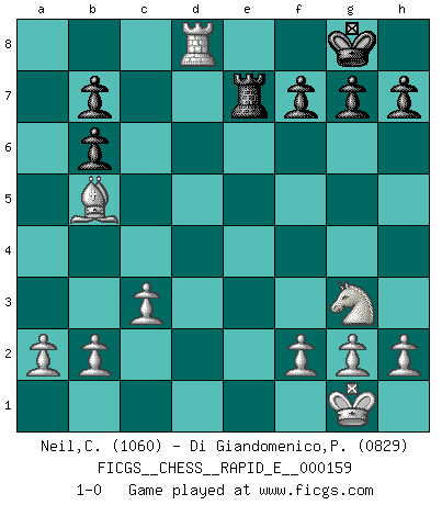 Last move : 1-0 2015 November 4 13:2:33 [Event "FICGS__CHESS__RAPID_E__000159"] [Site "FICGS"] [Date "2015.09.24"] [Round "1"] [White "Neil,Charlie"] [Black "Di Giandomenico,Pierino"] [Result "1-0"] [WhiteElo "1060"] [BlackElo "0829"] 1.e4 e5 2.Nf3 d6 3.Bc4 Nf6 4.d4 Nxe4 5.O-O Be7 6.dxe5 O-O 7.exd6 cxd6 8.Re1 Be6 9.Bd3 Bf5 10.Be3 Nc6 11.Nbd2 Qd7 12.Qe2 Nb4 13.Bb5 Qc7 14.c3 Nc2 15.Nxe4 Nxa1 16.Rxa1 Bxe4 17.Nd2 Qb6 18.Nxe4 Rac8 19.Bxb6 axb6 20.Rc1 d5 21.Ng3 Bg5 22.Rd1 Rfe8 23.Qd3 Re6 24.Qxd5 Re7 25.Qxg5 Rce8 26.Qxe7 Rxe7 27.Rd8+ 1-0 Philidor's defense Kingside Castling by player White (move 5) Kingside Castling by player Black (move 6) Player White won this chess game. Follow this game move after move (download)Chess is not like life... it has rules ! (Mark Pasternak) Ohne ihre Erfolge schmälern zu wollen würde ich sagen Petrosian, Spassky und Karpov verdanken ihre Siege ihren Trainern - Boleslavsky, Bondarevsky und Furman. (Mikhail Moiseyevich Botvinik) Solo el jugador con la iniciativa tiene el derecho a atacar. (Wilhelm Steinitz) L'ordinateur a tué l'originalité. Il n'y a plus guère d'aventures sur l'échiquier. (Jacob Murray) Nothing is more important for teaching us to understand the concepts we have than constructing fictitious ones. (Ludwig Wittgenstein)